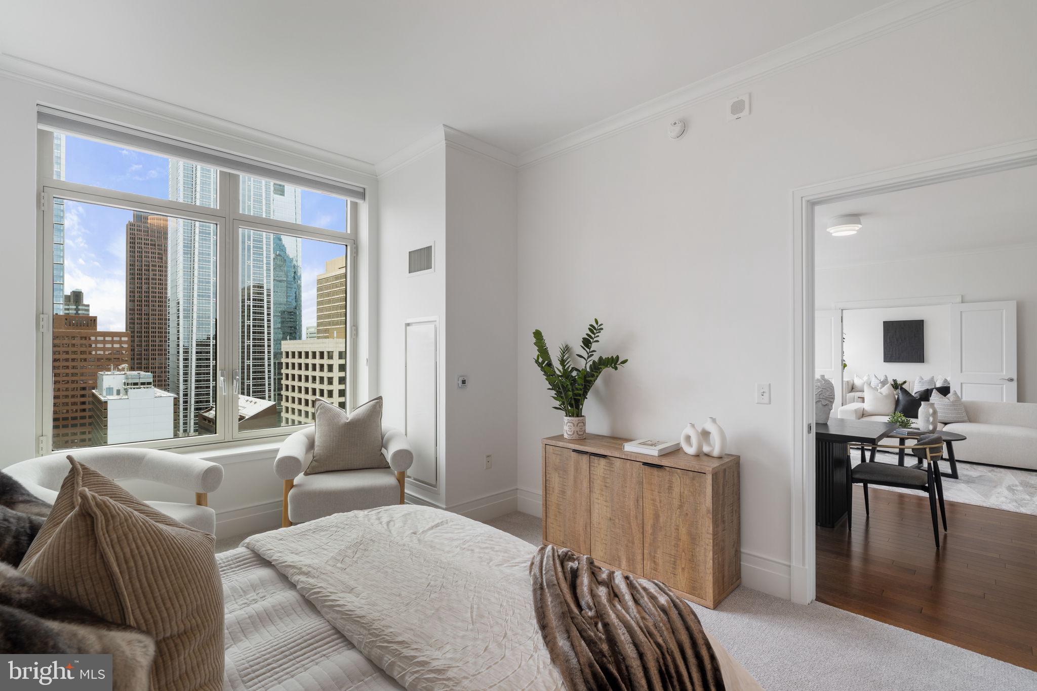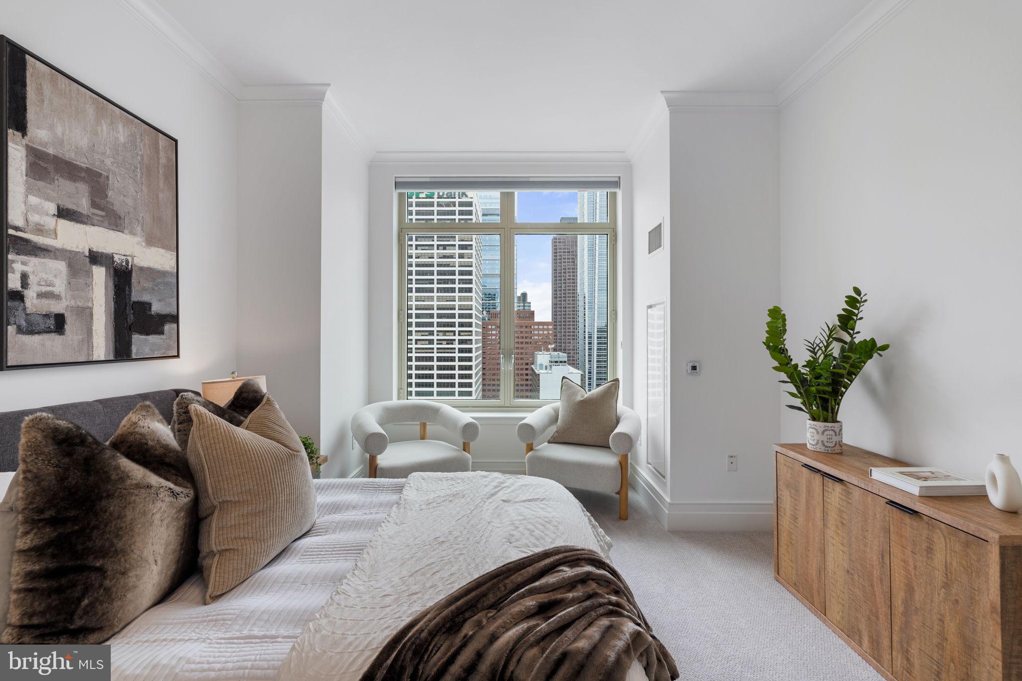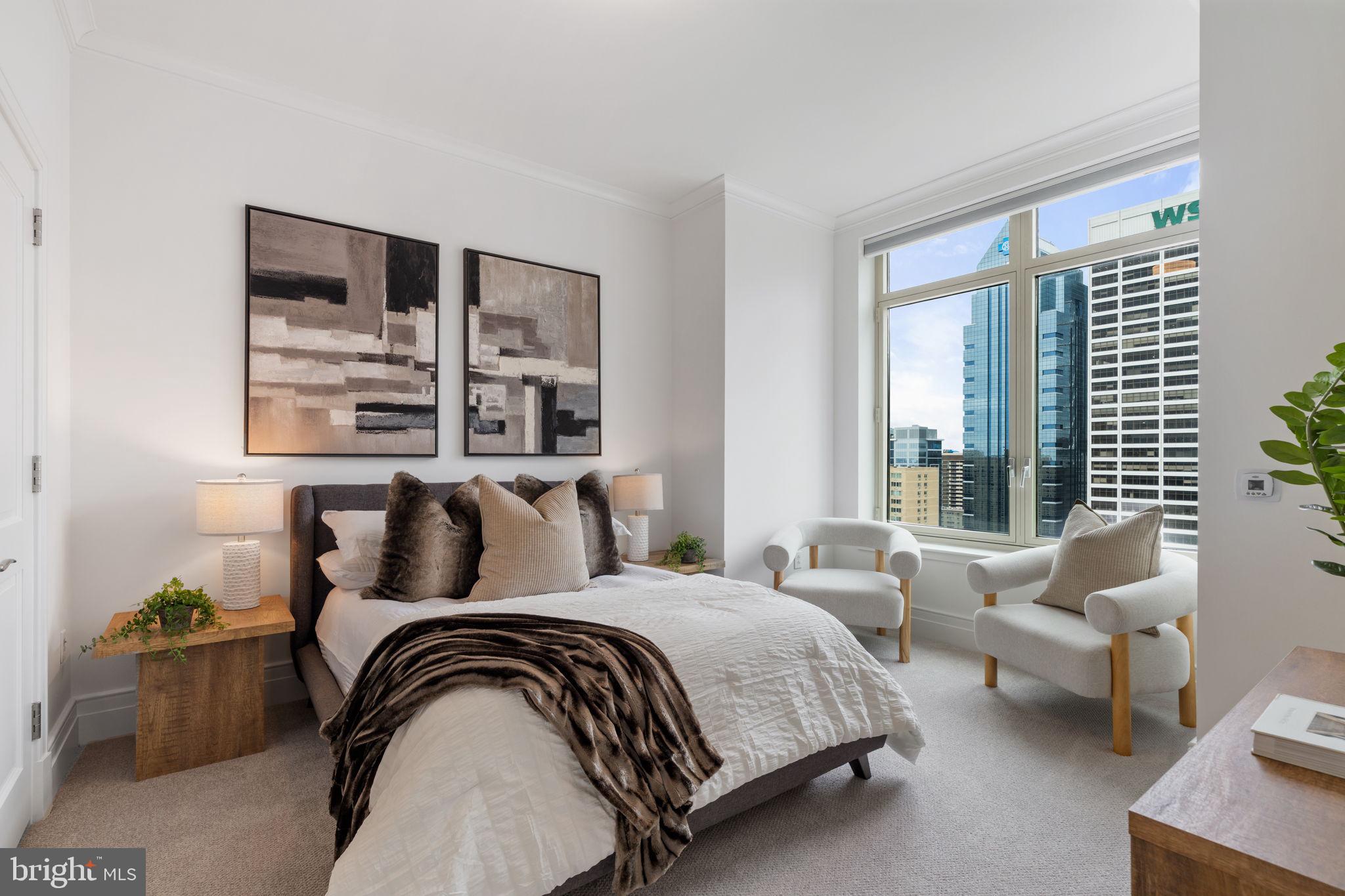 Experience 10 | Live at 10. Welcome to residence 2502, a high floor 3 bed 3.5 bath designer condo with knockout skyline views. This versatile split bedroom design offers the perfect flow and lifestyle. A large eat-in chef's kitchen balances practicality with sophistication and features white Poggenpohl cabinetry, an informal dining option, an oversized island, Subzero, Wolf and Miele appliances. Drift into the grand living space measuring over 25 feet wide with floor to ceiling windows. A flexible space with tremendous scale where you can have dinner parties or relax with your loved ones on a huge sectional. Enjoy your art collection displayed on expansive walls. Off of the main living room through beautiful shaker french doors you'll find a 3rd bedroom (currently used as a den / office ) with an en-suite marble bathroom. On the west end of the condo you'll find a lovely guest bedroom with two closets and an en-suite as well. This guest bedroom can function as a work from home space if preferred. A hallway separates the entertaining areas from the private sanctuary of the primary suite which features dramatic views, a pristine spa-like 5 piece marble bathroom and a large walk-in closet. The next owner will also enjoy a brand new paint job (all walls, trim, ceilings) and brand new wall to wall carpet in all bedrooms (3). 2502 has over 60 feet of skyline frontage and this floor has higher ceilings than almost any other in the building. A true 3 bedroom condo with plenty of versatility... an incredibly efficient layout and use of square footage. Robert A.M. Stern, the famed architect responsible for iconic buildings such as 520 Park Avenue, 220 Central Park South and 15 Central Park West designed a masterful building on our beloved Philadelphia park. Residents enjoy 5 star 24 hour service, a chauffeured driven town car, yoga room, a brand new gym, new sauna, new steam, indoor lap pool, library, outdoor courtyard, board meeting room, piano lounge, TV lounge, climate controlled wine room, bike storage, catering kitchen, hotel guest suite, underground valet parking and most importantly a friendly and beautiful community. Philadelphia's TOP SPA, Rescue Spa has opened in the building for the ultimate convenient amenity along with Philadelphia hottest restaurant opening Borromini. Pet friendly. ****** Located on prime 18th street where the best restaurants in town are at your finger tips. Pet friendly. One Storage unit included with this sale as well as One Parking License.