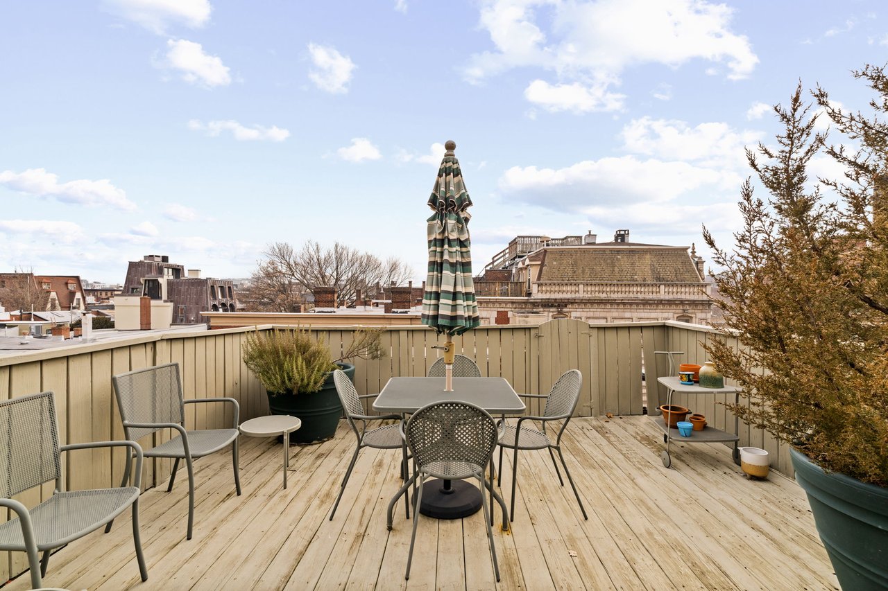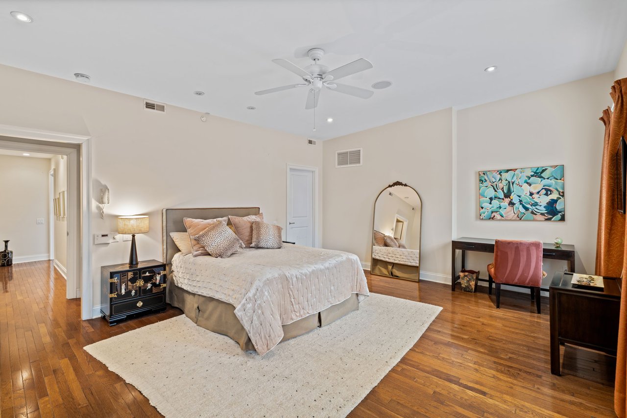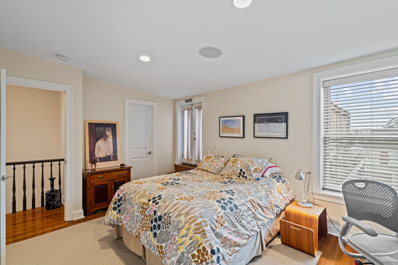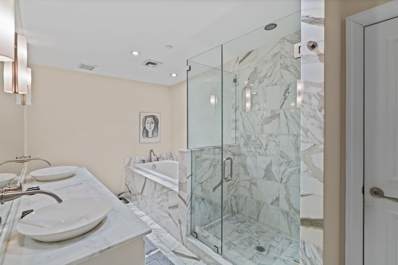 The primary suite is a true retreat, generously scaled with space for a separate sitting area and complemented by a very large walk-in closet. The spa-like marbled bath features dual vanities, a glass-enclosed shower, and a soaking tub, creating a serene and luxurious experience. The second bedroom features an en-suite bath and direct access to the home’s second private rooftop deck which offers the best of both worlds — sunny southern exposure and dramatic city skyline views to the north. This guest bedroom offers exceptional flexibility for guests, a home office, or both.