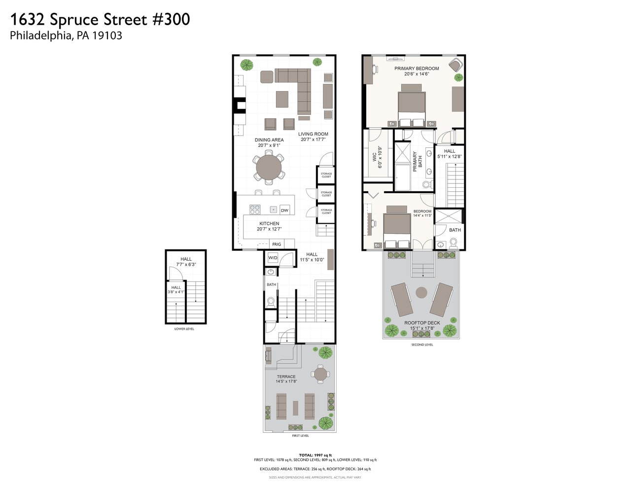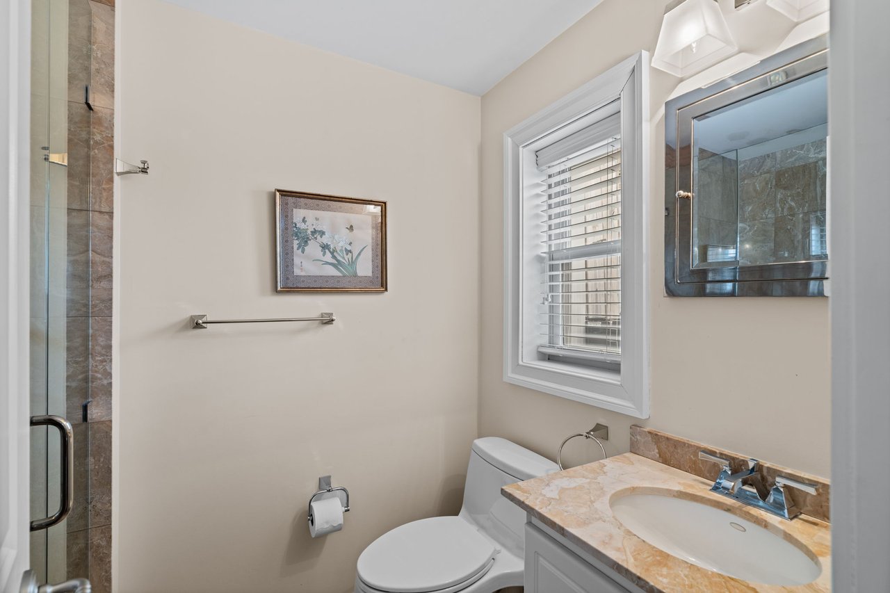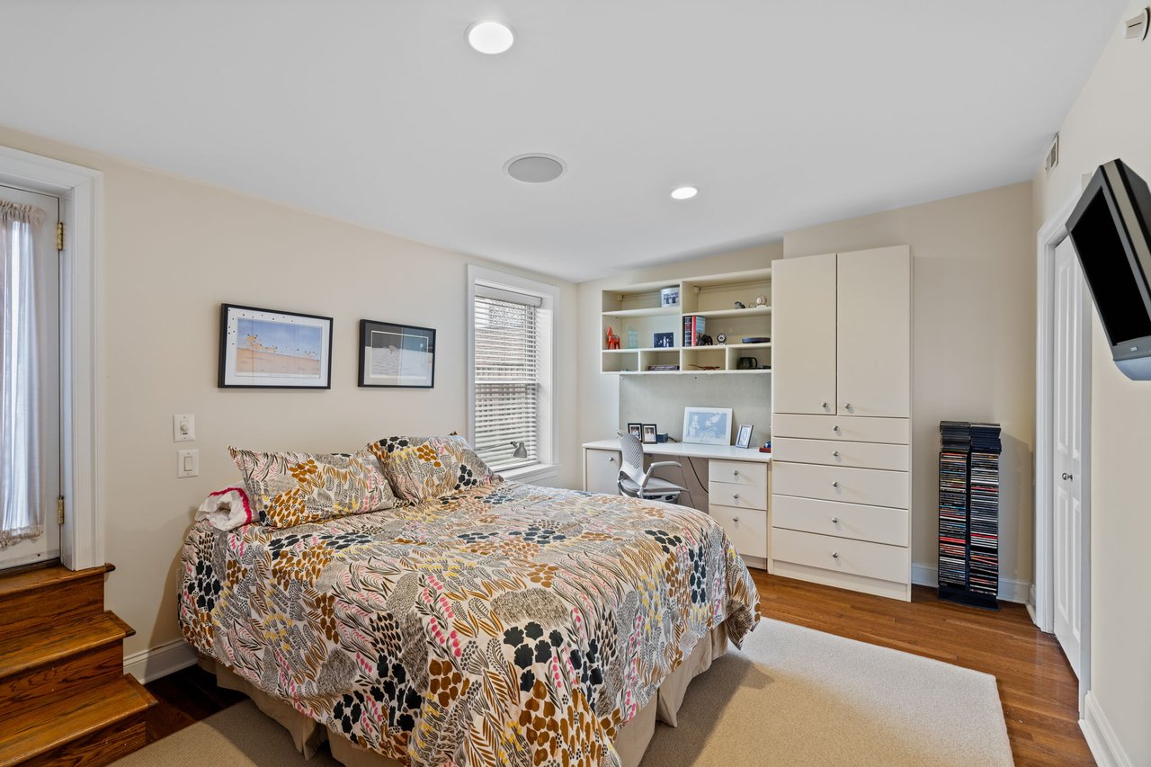 The primary suite is a true retreat, generously scaled with space for a separate sitting area and complemented by a very large walk-in closet. The spa-like marbled bath features dual vanities, a glass-enclosed shower, and a soaking tub, creating a serene and luxurious experience. The second bedroom features an en-suite bath and direct access to the home’s second private rooftop deck which offers the best of both worlds — sunny southern exposure and dramatic city skyline views to the north. This guest bedroom offers exceptional flexibility for guests, a home office, or both.