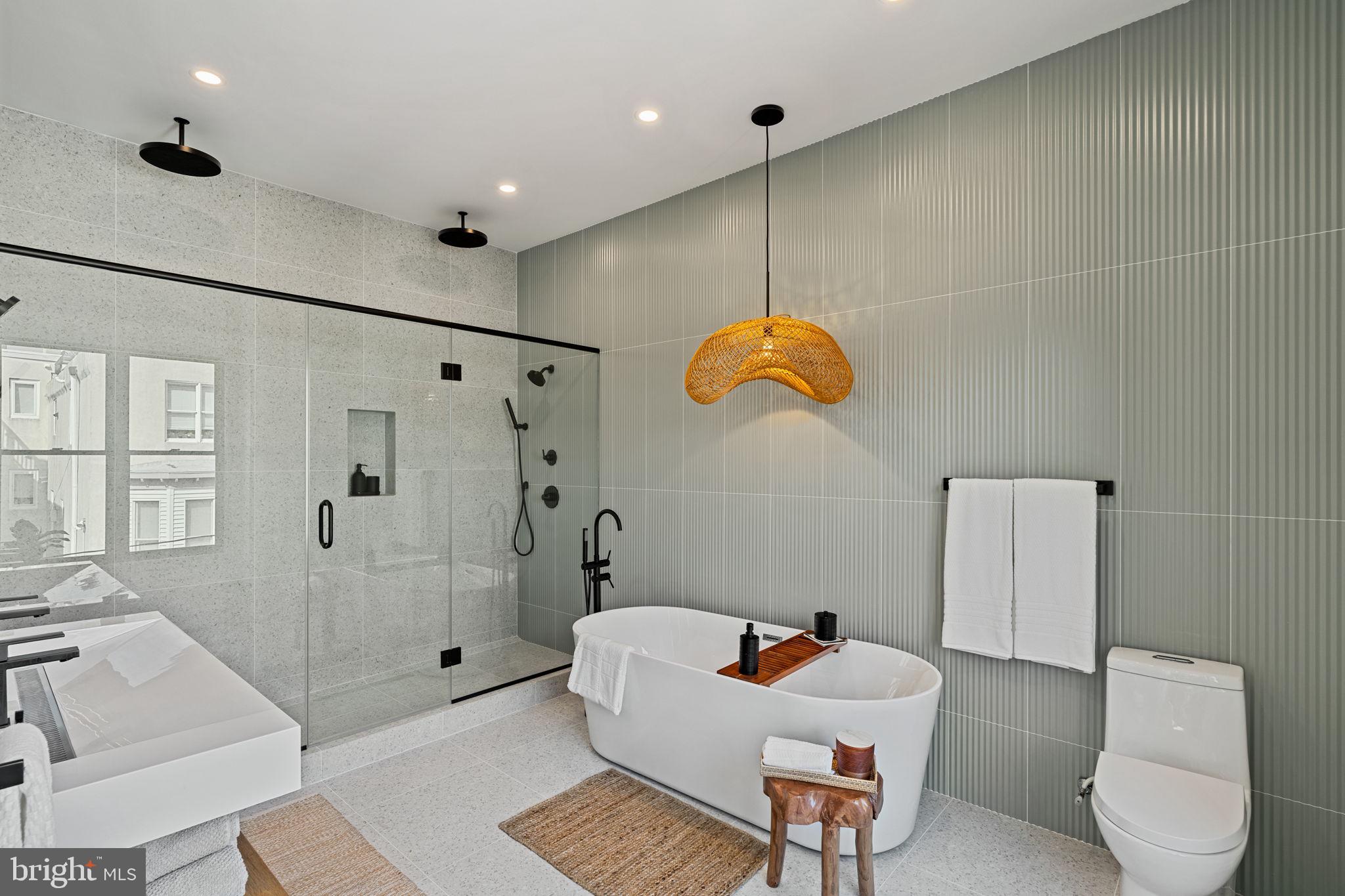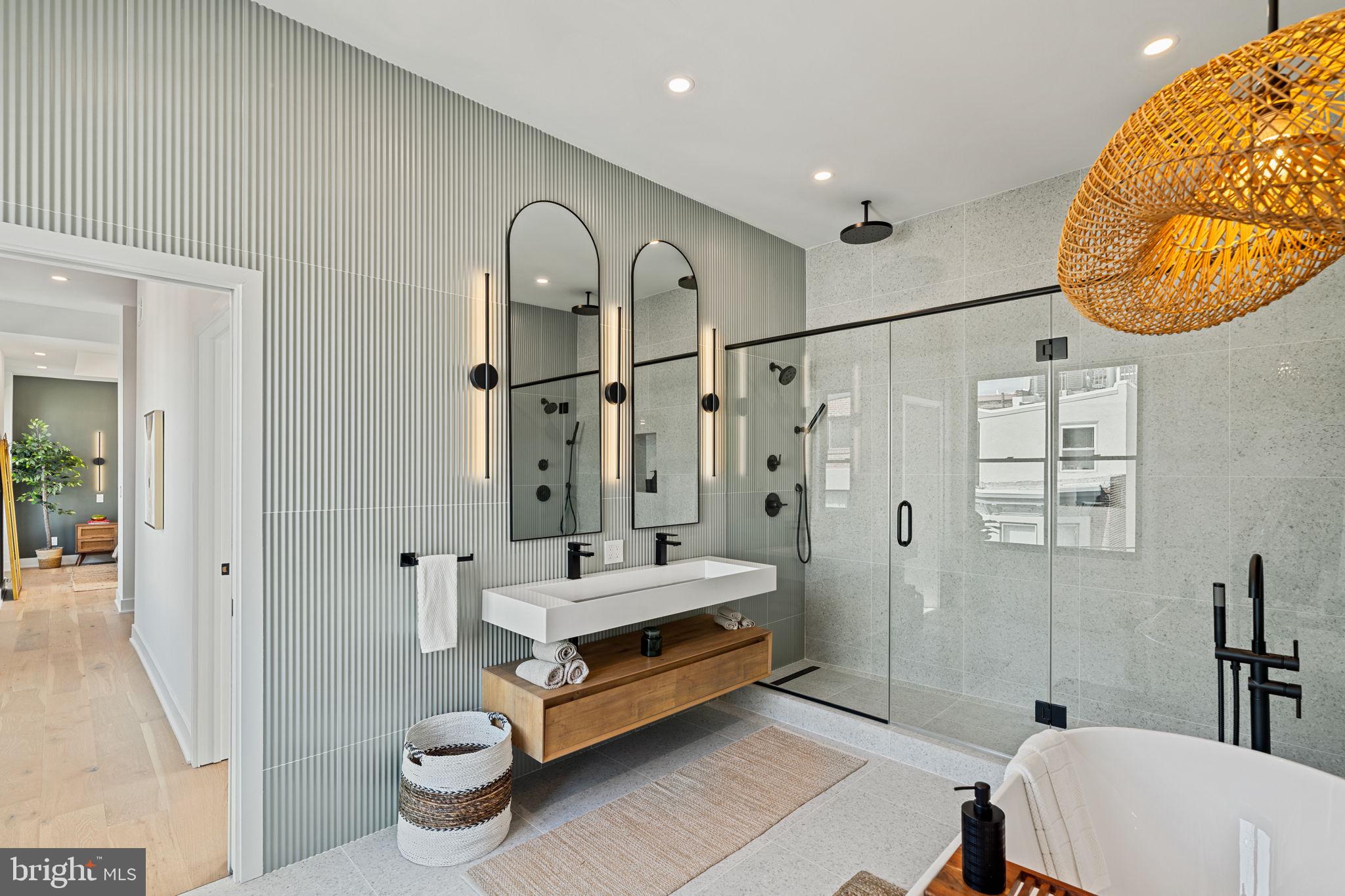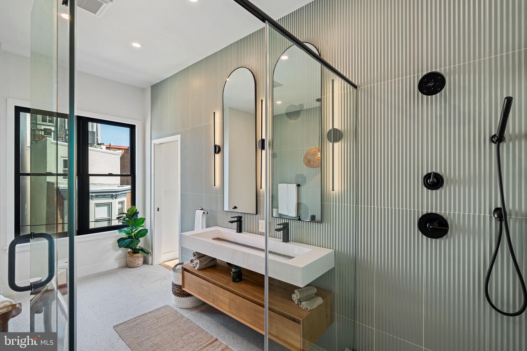 Third Floor The entire top floor is dedicated to the primary suite, a private sanctuary above the city. Here, soaring ceilings and natural light create an airy retreat. The spa-inspired ensuite features a bespoke glass-enclosed two-person shower, large fluted tiled walls, and a sculptural freestanding tub, blending luxury and tranquility. Custom walk-in closets provide exceptional storage, while direct access to a private terrace offers an intimate outdoor escape for morning coffee or evening relaxation.