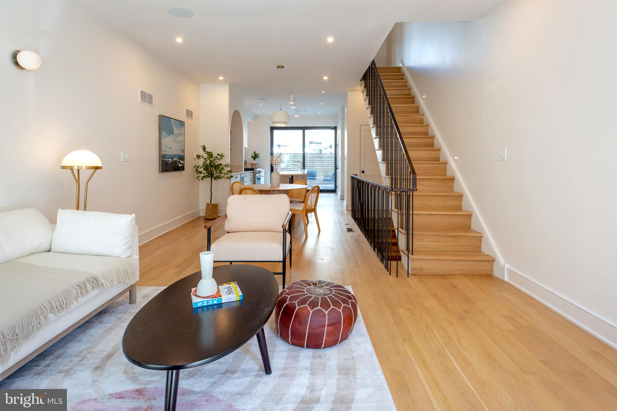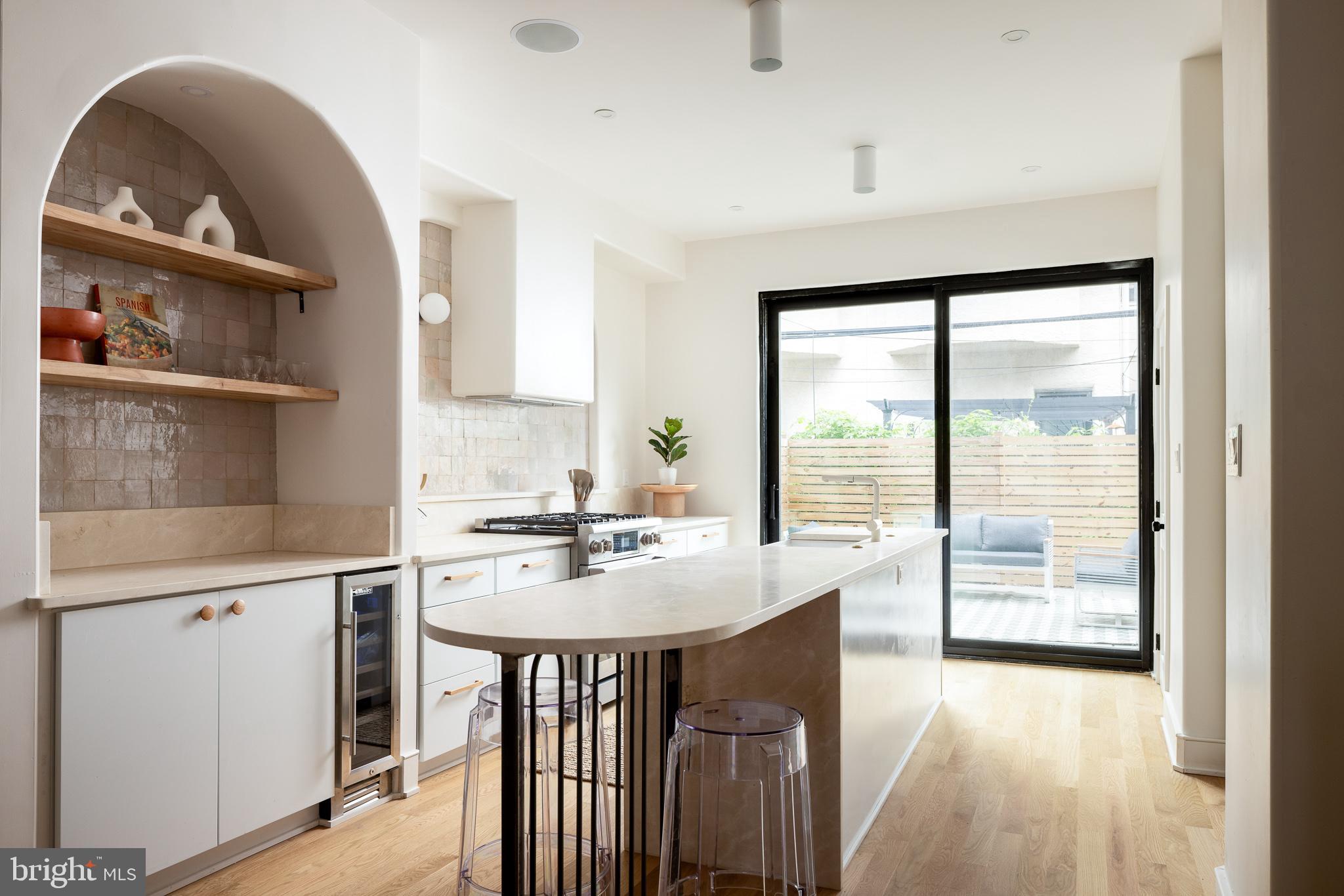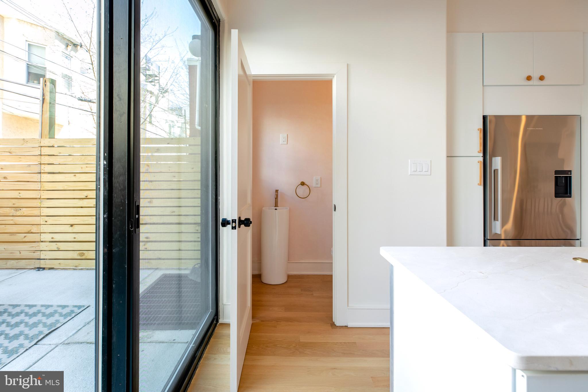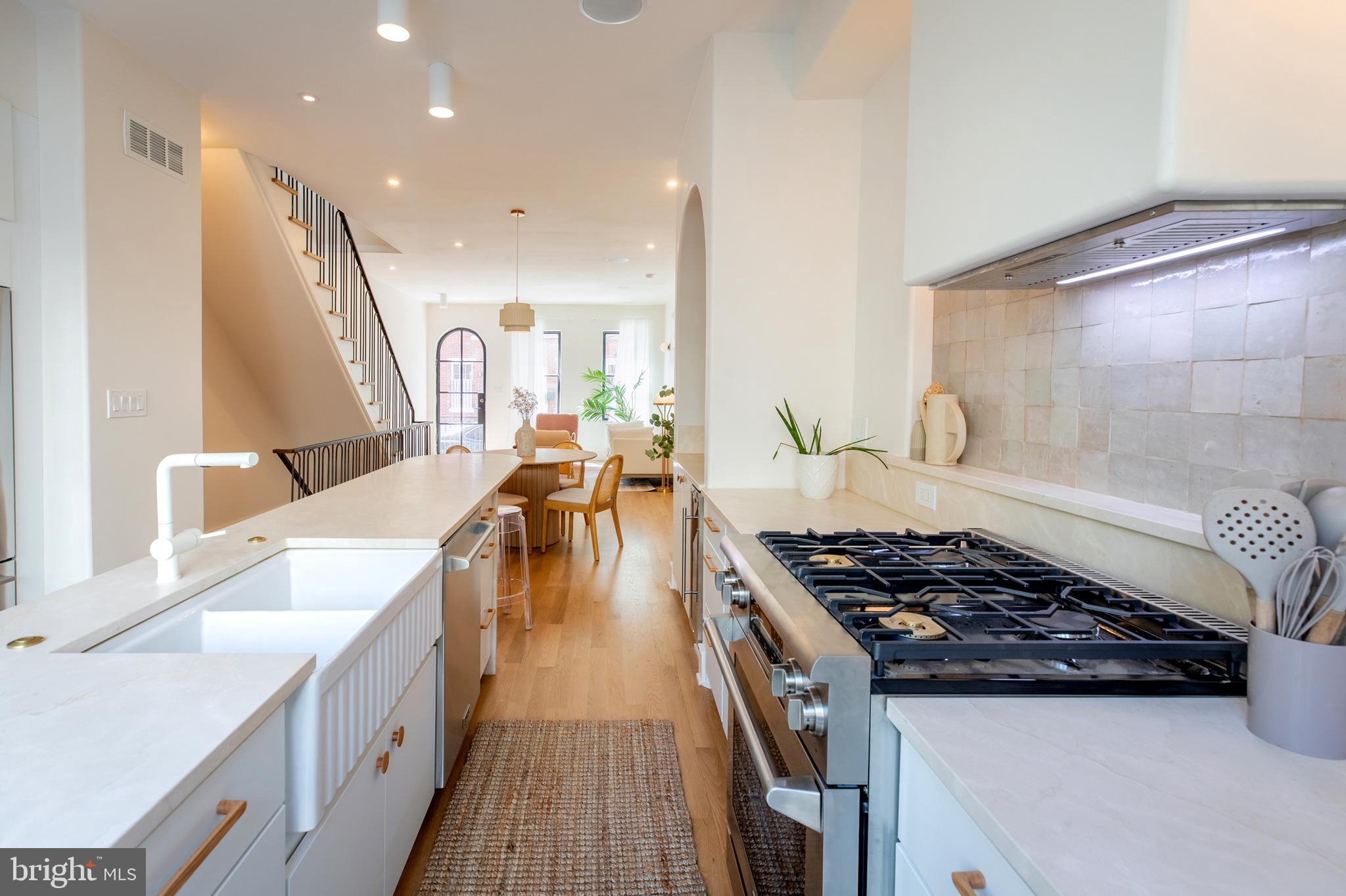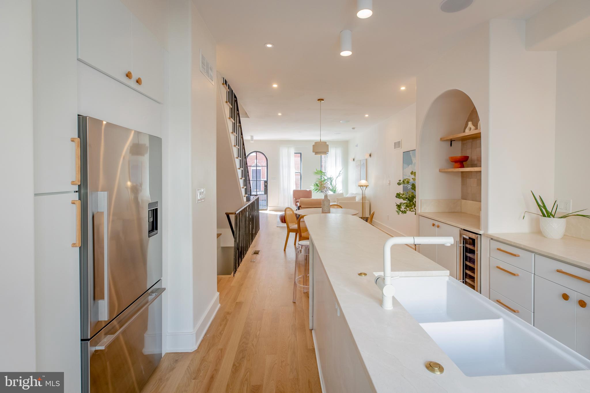 Step through an arched front steel door and rebuilt facade, into a very stylish living level that has a generous amount of space for lounging and dining, as well as a powder room and fabulous kitchen. The kitchen includes a long central island, bar area, thoughtfully designed cabinetry, and high end appliances. Seating along one side of the kitchen island is ideal for casual dining, food prep, and entertaining. In the rear of the first floor, glass doors provide fantastic daylight in the kitchen and lead outside to a private back patio.