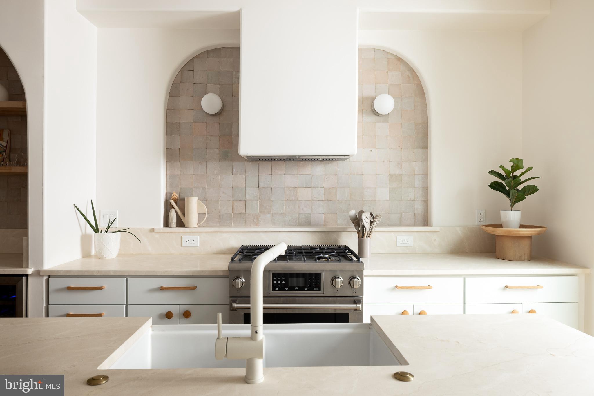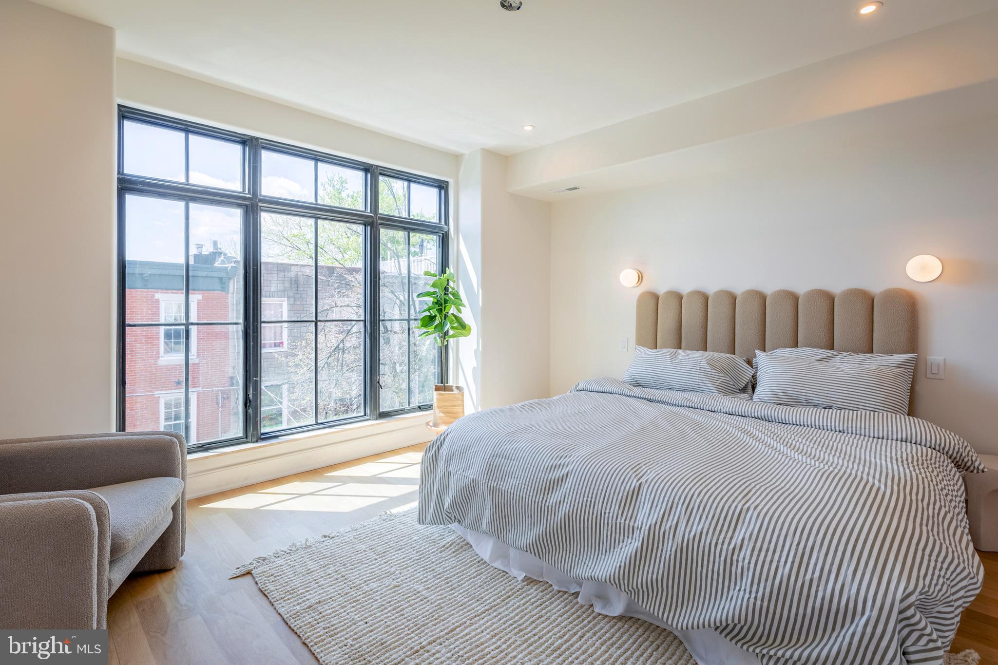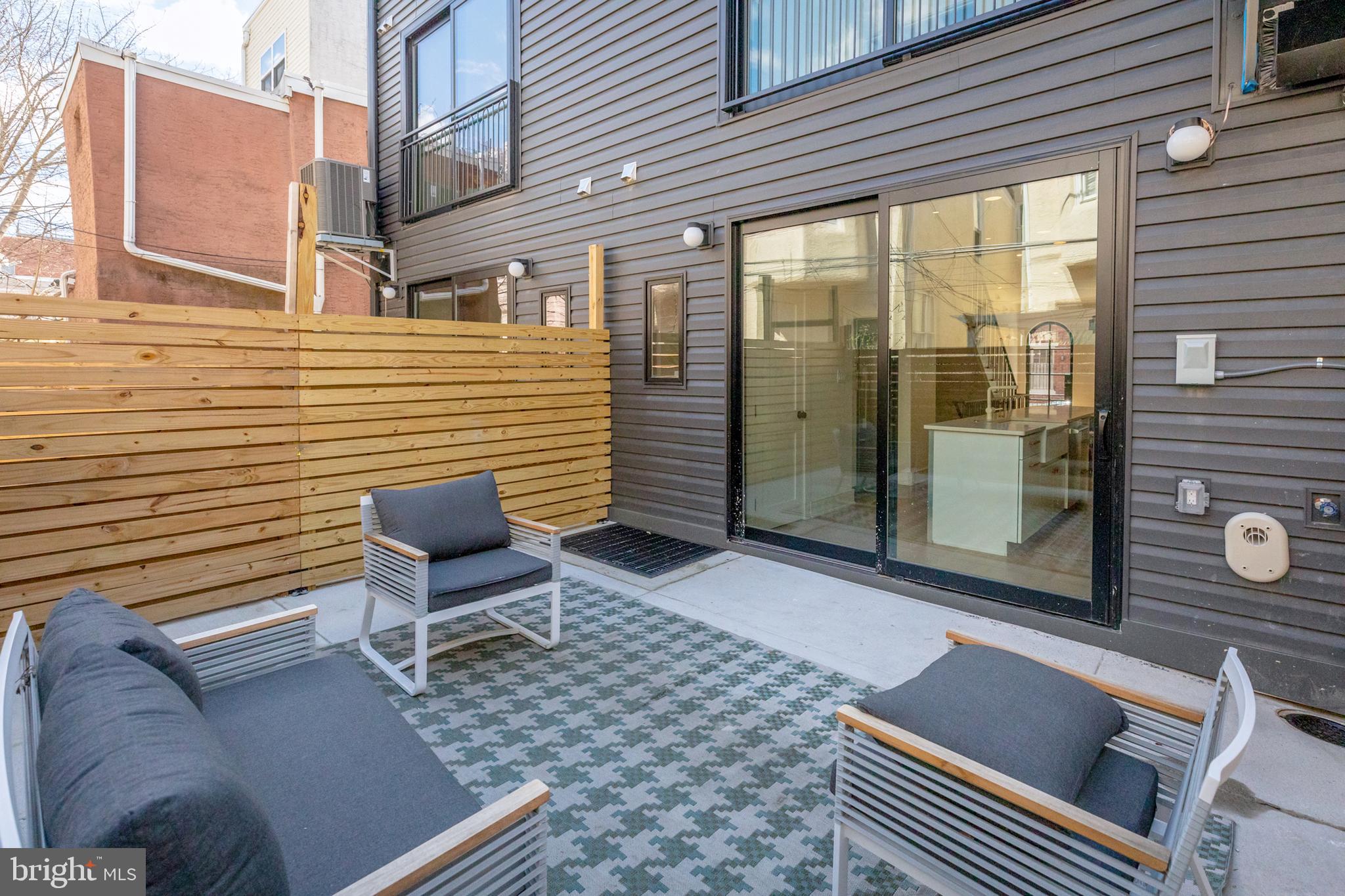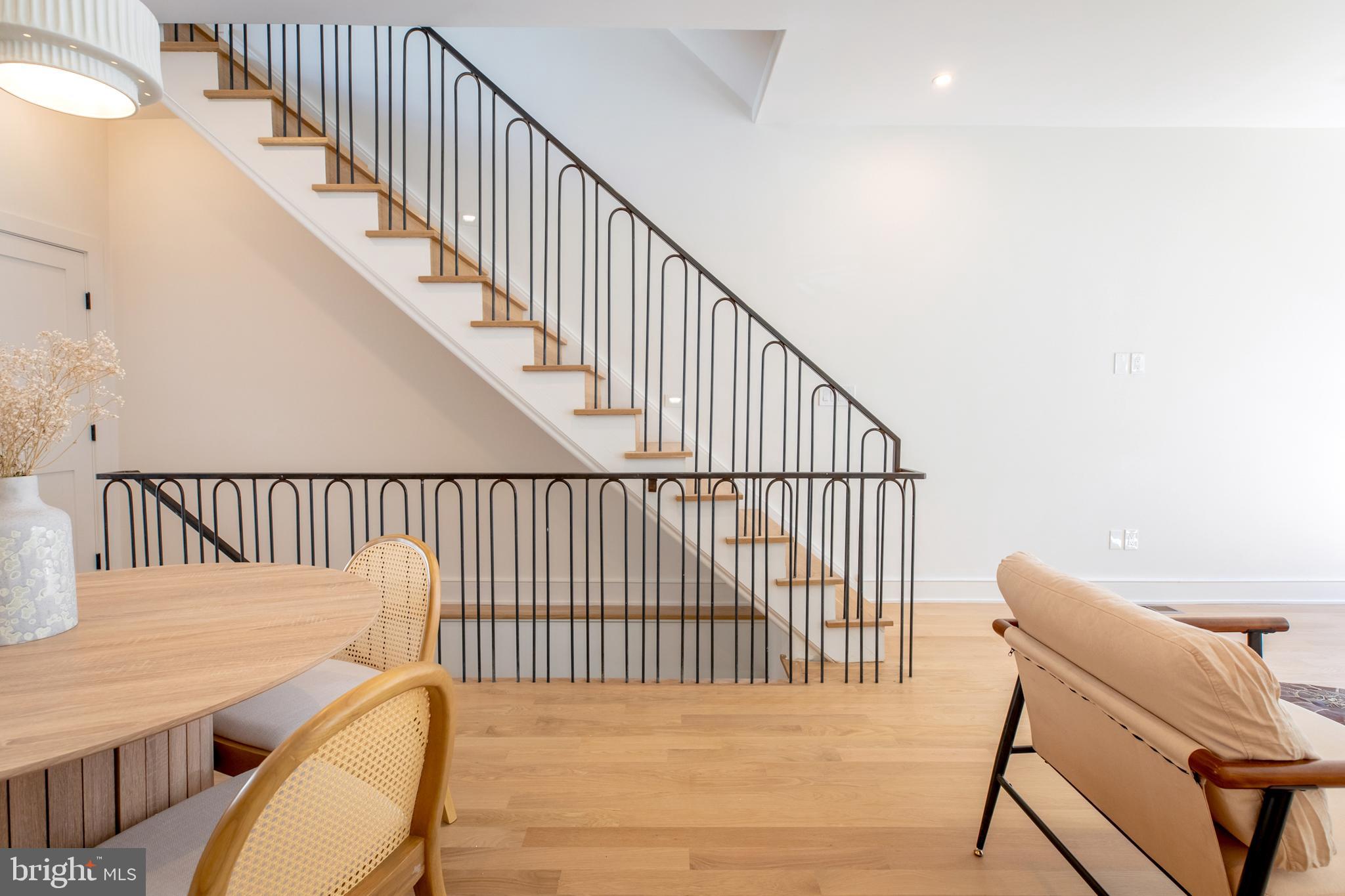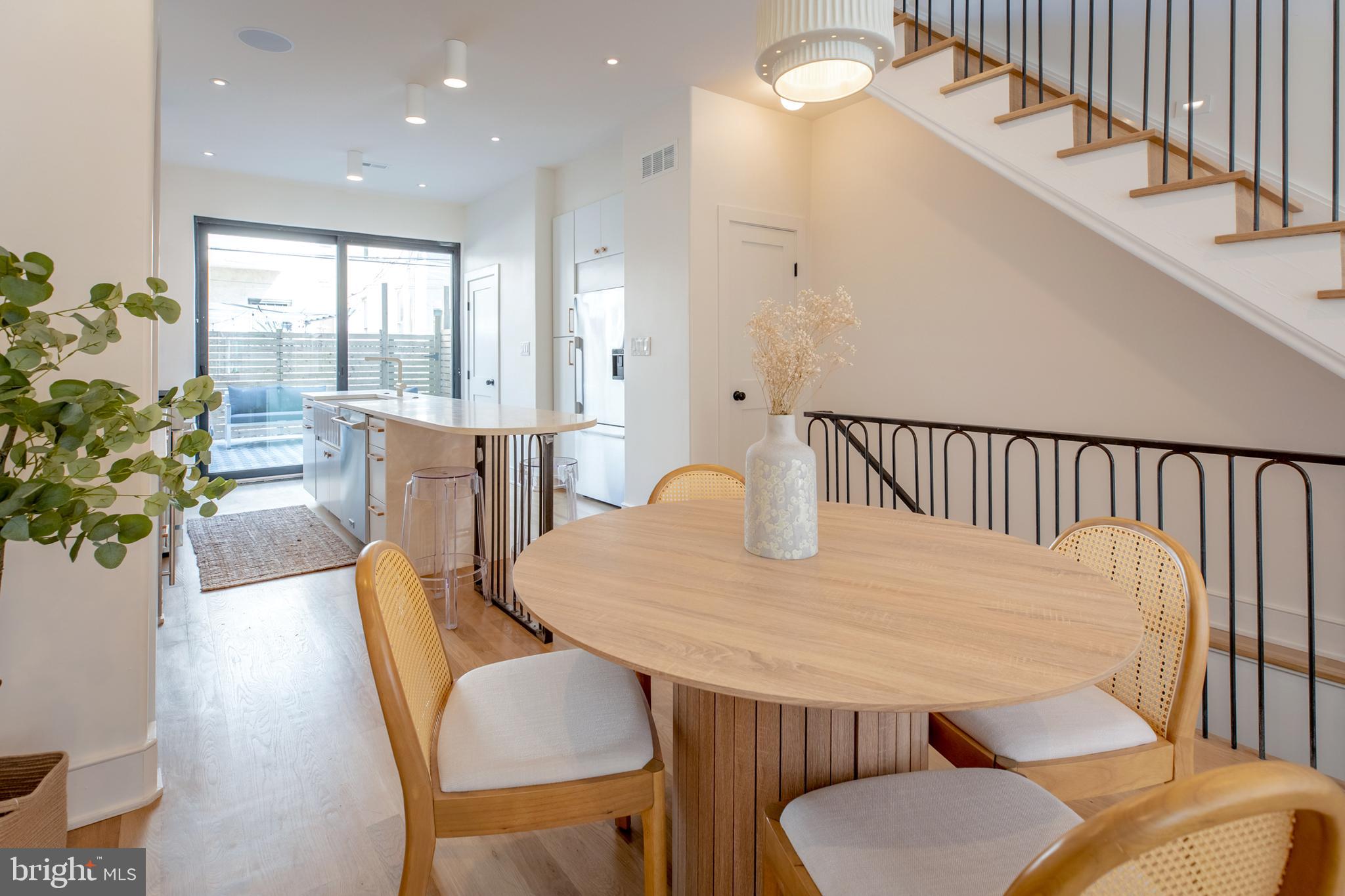 Step through an arched front steel door and rebuilt facade, into a very stylish living level that has a generous amount of space for lounging and dining, as well as a powder room and fabulous kitchen. The kitchen includes a long central island, bar area, thoughtfully designed cabinetry, and high end appliances. Seating along one side of the kitchen island is ideal for casual dining, food prep, and entertaining. In the rear of the first floor, glass doors provide fantastic daylight in the kitchen and lead outside to a private back patio.