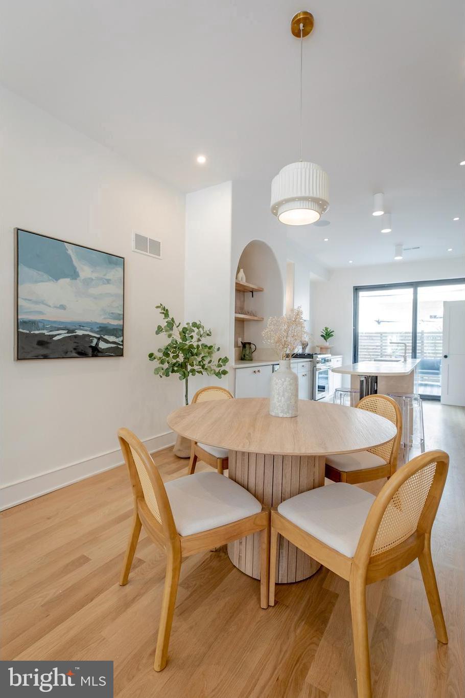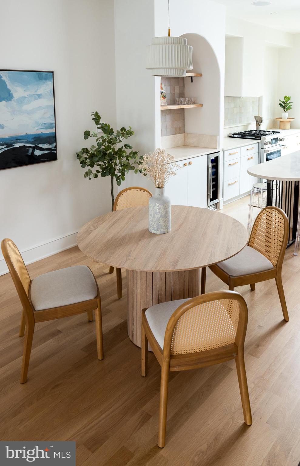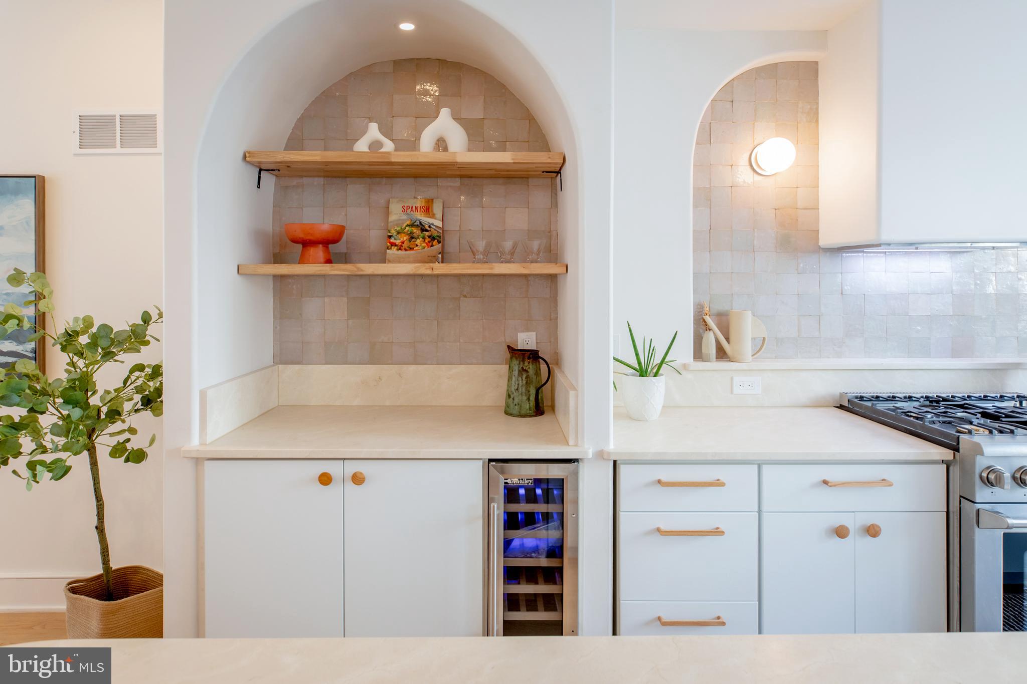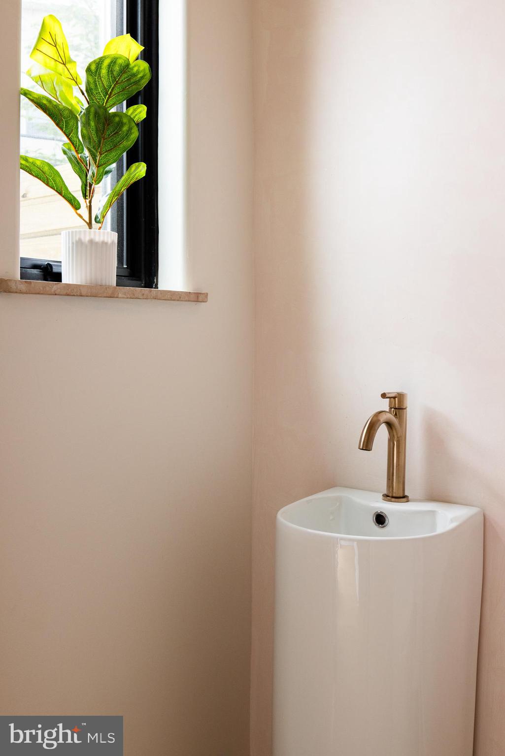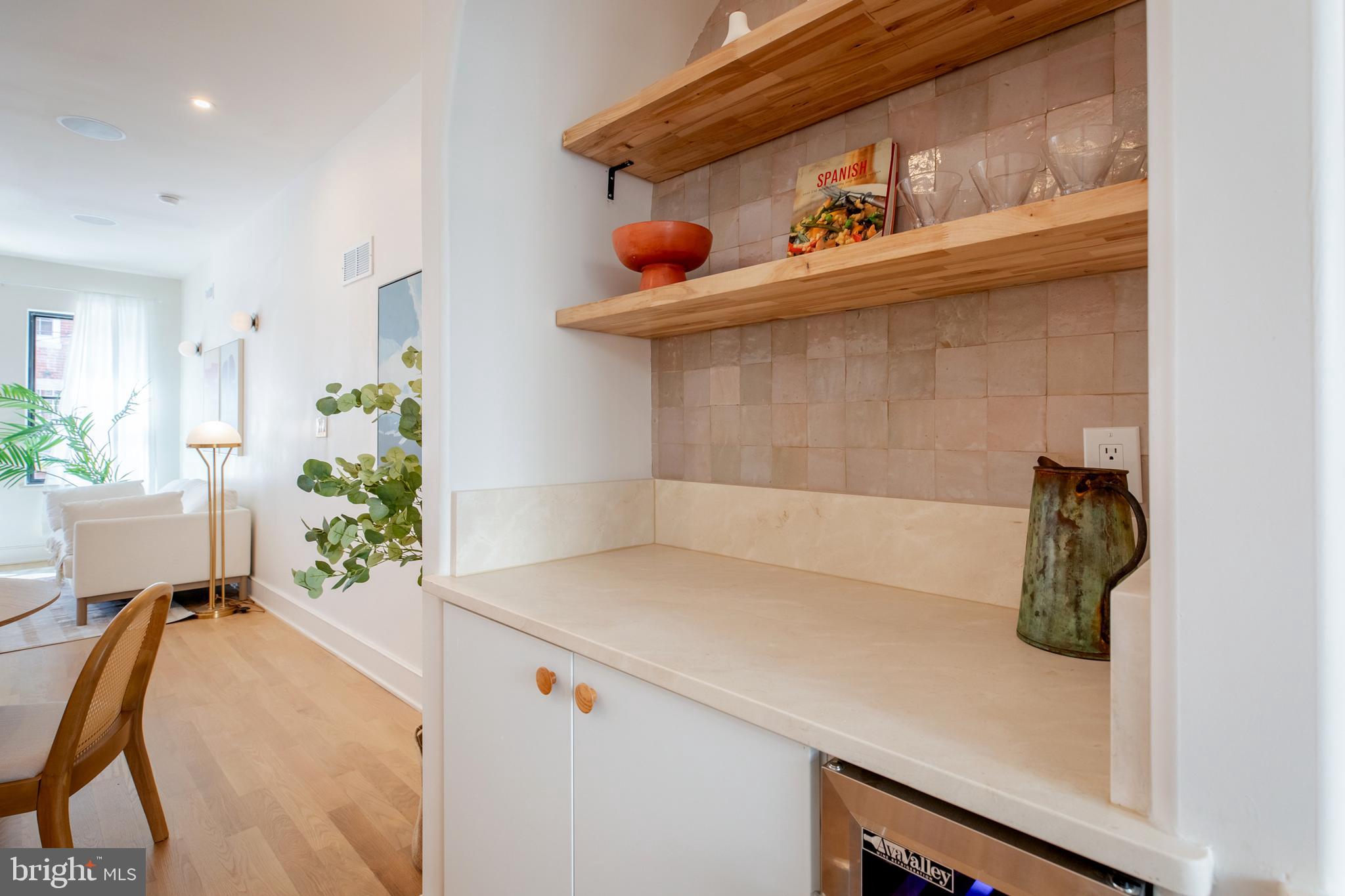 Step through an arched front steel door and rebuilt facade, into a very stylish living level that has a generous amount of space for lounging and dining, as well as a powder room and fabulous kitchen. The kitchen includes a long central island, bar area, thoughtfully designed cabinetry, and high end appliances. Seating along one side of the kitchen island is ideal for casual dining, food prep, and entertaining. In the rear of the first floor, glass doors provide fantastic daylight in the kitchen and lead outside to a private back patio.