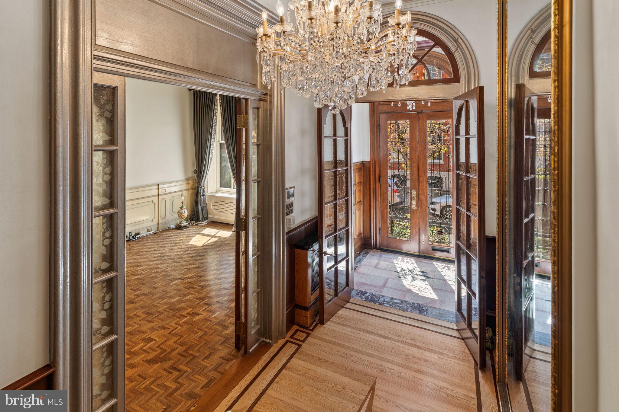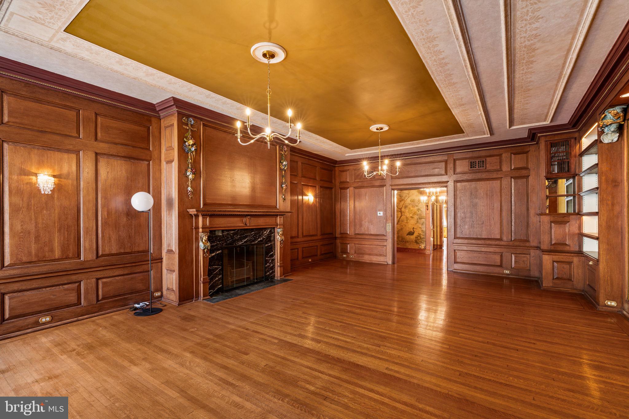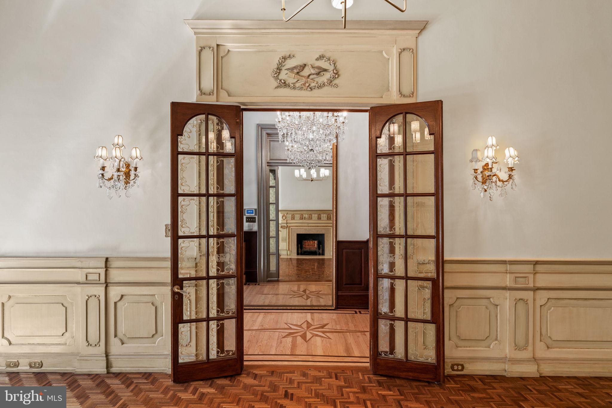 The Parlor Level's wide entry gallery, grand staircase and 11.5 foot mirror framed in 24-carat gold welcomes you to the home, setting the stage for the glorious charm of yesteryear with original doors, fireplace mantels, flooring, and moldings--each telling stories of their own. The first floor greets you with impressive 12.5-foot ceilings and one of the nine fireplaces that grace this home, creating an atmosphere of warmth and sophistication.