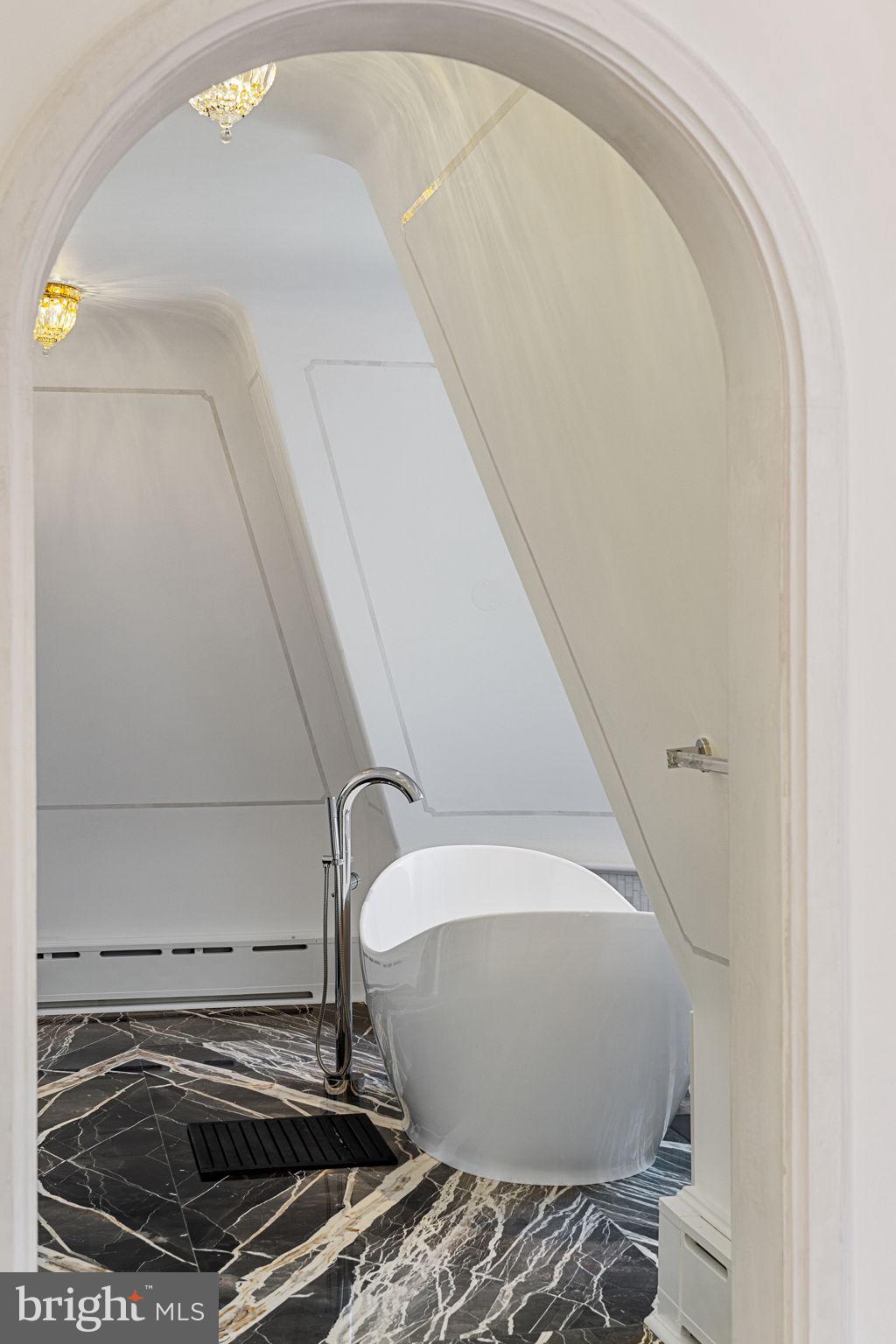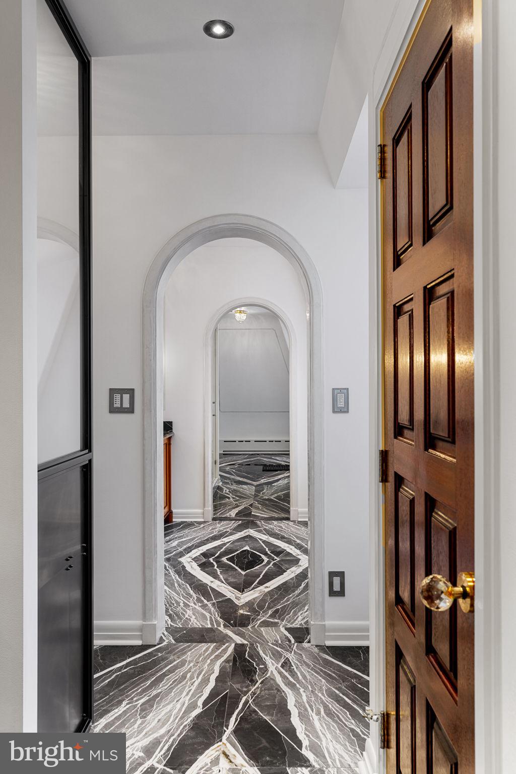 Ascend to the third floor, where the primary suite awaits, complete with a magazine-worthy bathroom showcasing exquisite custom bronze and iron detailing by Amuneal, book matched imported Italian black Carrara marble, heated floors, arched halls and Venetian plaster. The third floor also hosts a guest suite with a full bathroom stretching the entire front of the home.