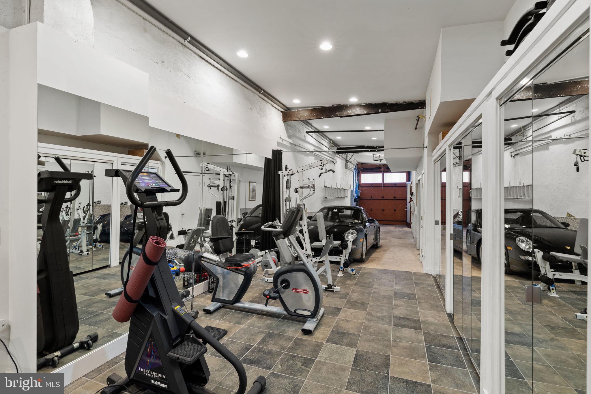 Mixed use space. Entrance to house and 2 car temperature controlled tandem garage. Mirrored Gym/Yoga studio. Big Ass Haiku Fan. Full Bath. Lots of storage space, generous (1,000+ bottles) Wine Cellar with N'finity SC3000 Whisperkool climate control system. Murphy bed for overnight guests.
