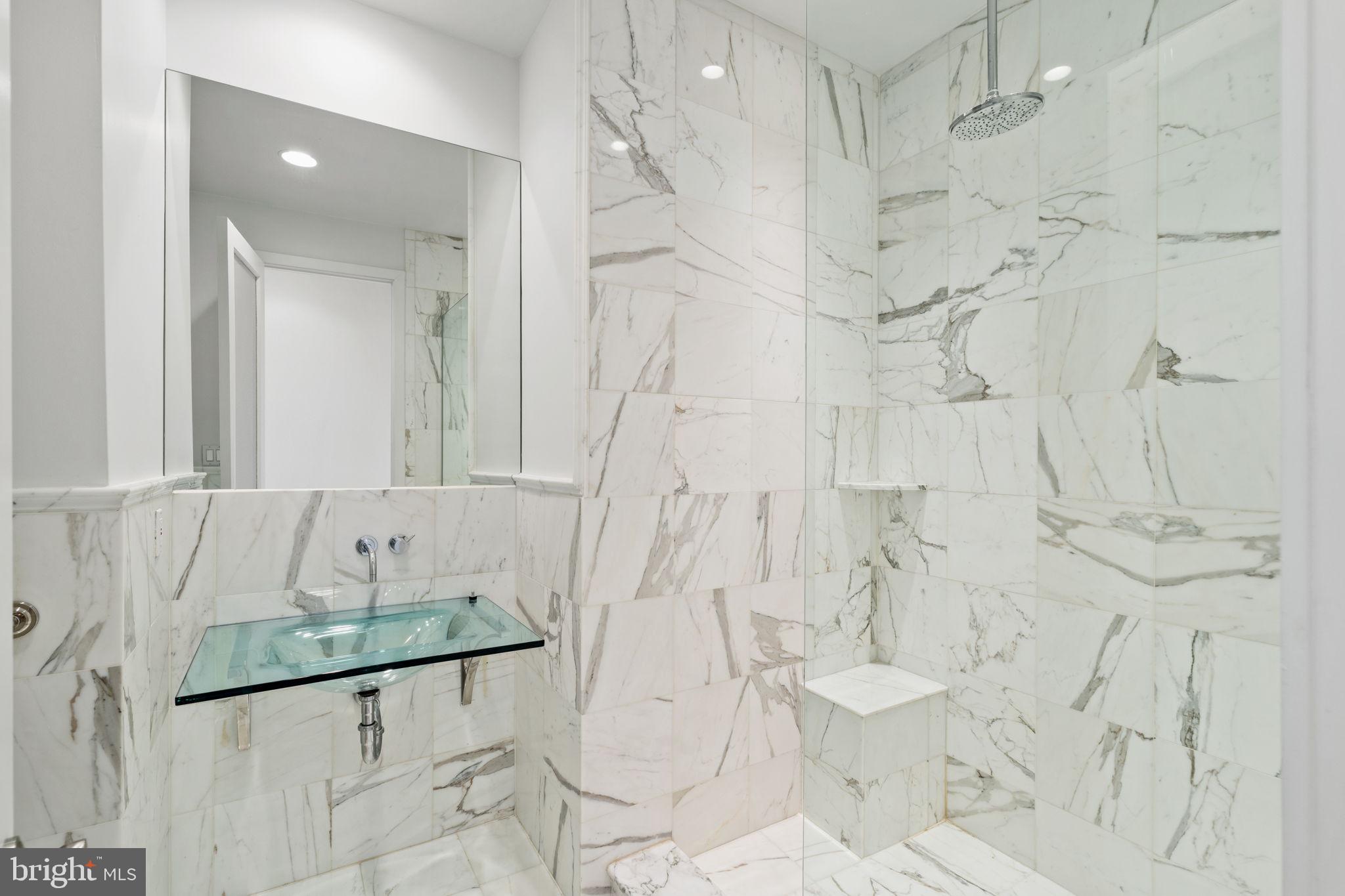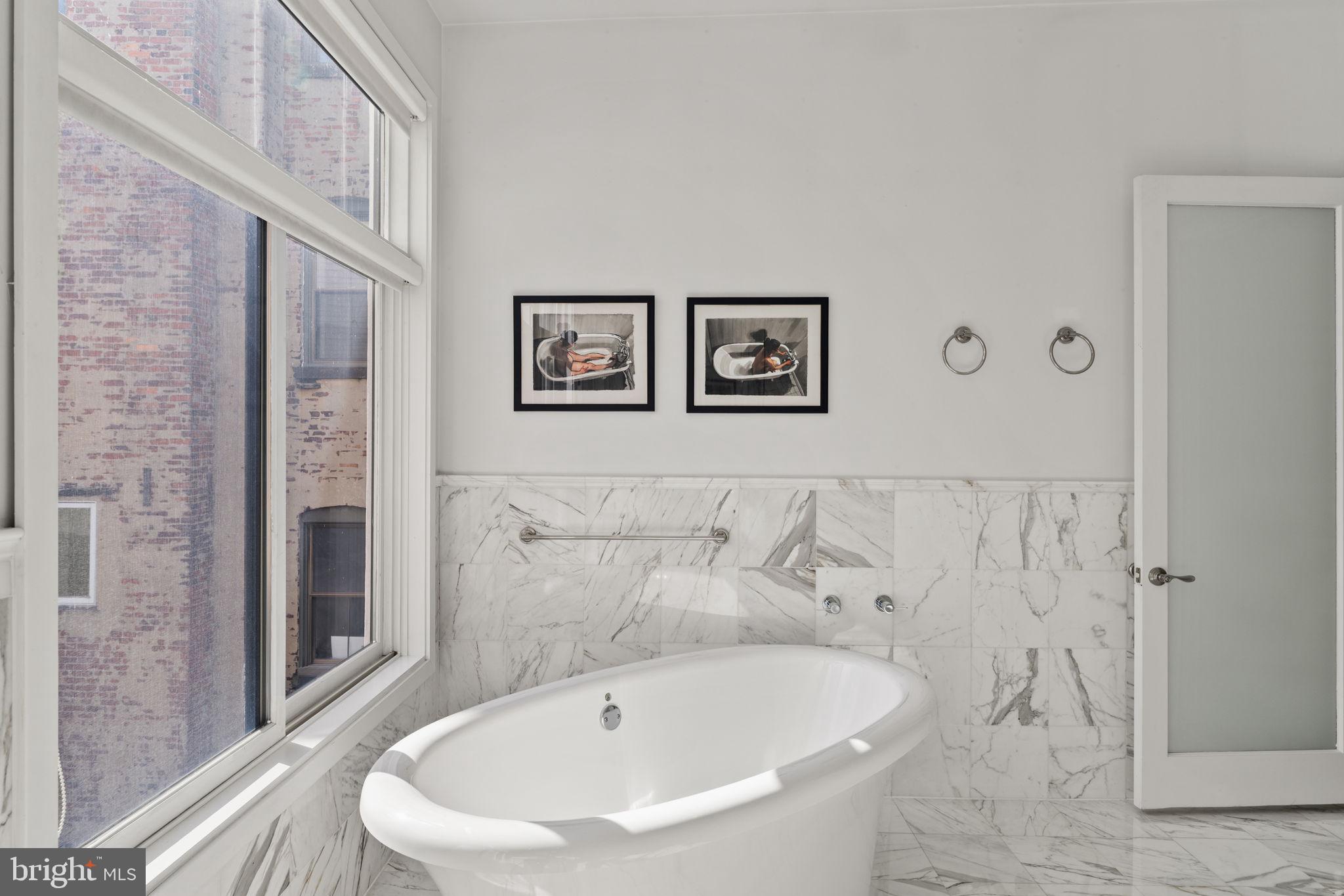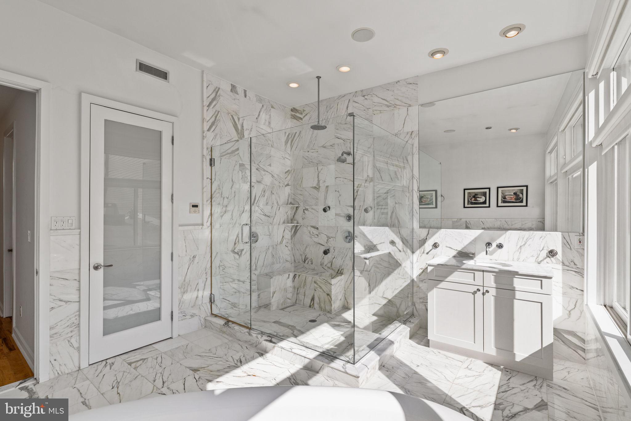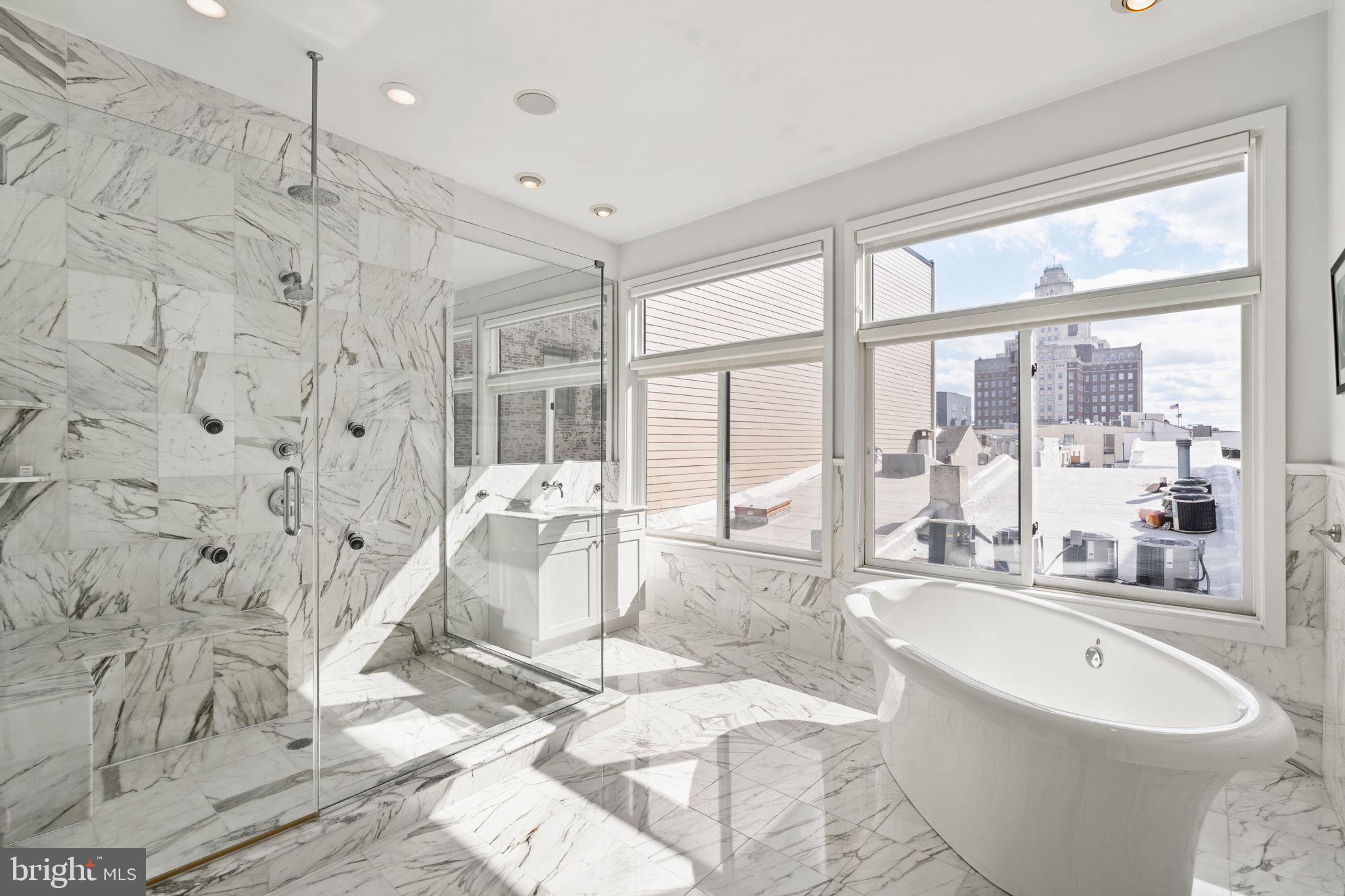 Primary Bedroom Suite constitutes the entire 4th floor. The bed chamber has a floor to ceiling window (which completes the "curtain wall effect from the exterior) with a vivid view of the Christ Church steeple. The hallway leading to the walk in closets, laundry room and full bath with oversized shower, passes along the open central atrium just beneath the large skylight. The natural light in this space is wonderful. The bath chamber also boasts a free standing soaking bathtub and acres of Calacata Borghini Carrara marble tile.