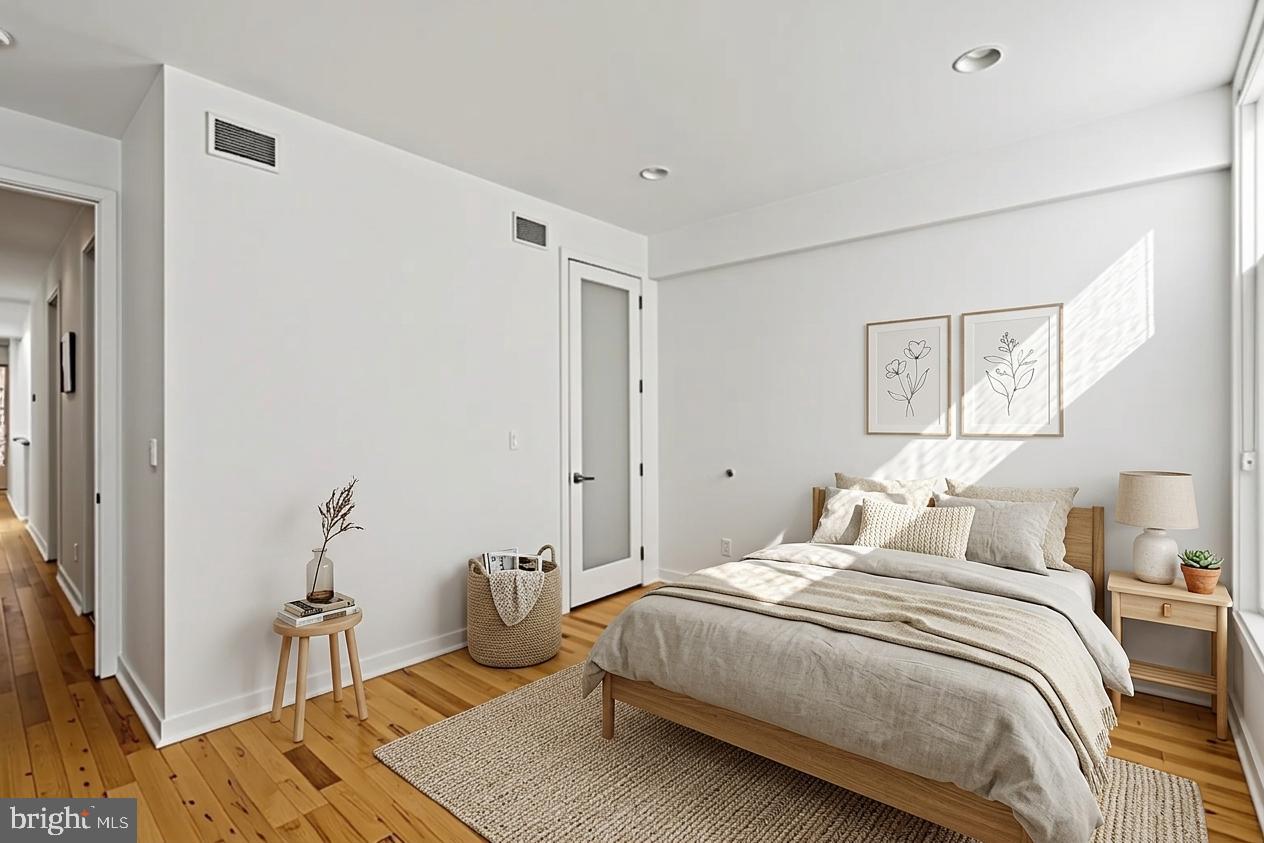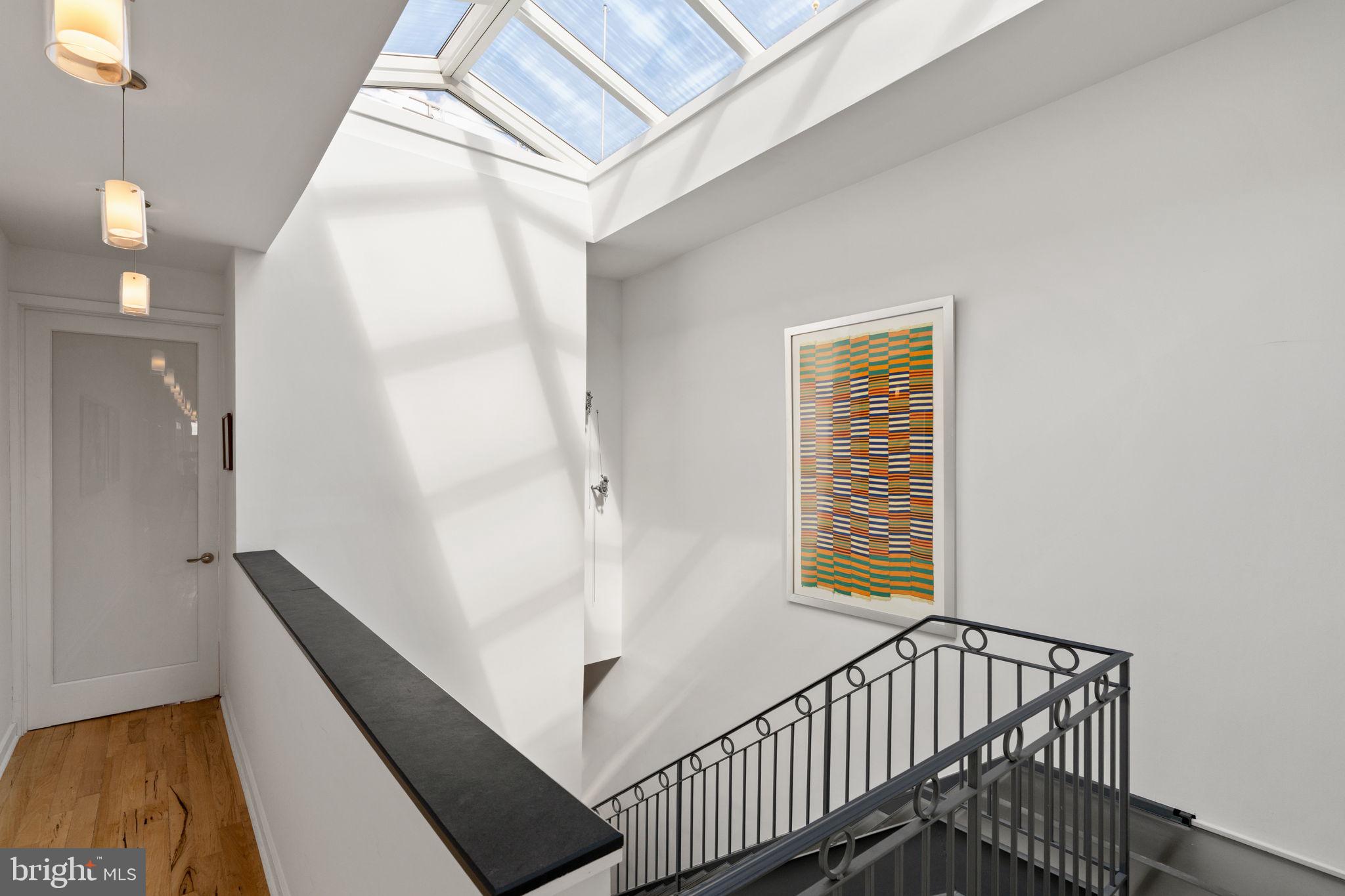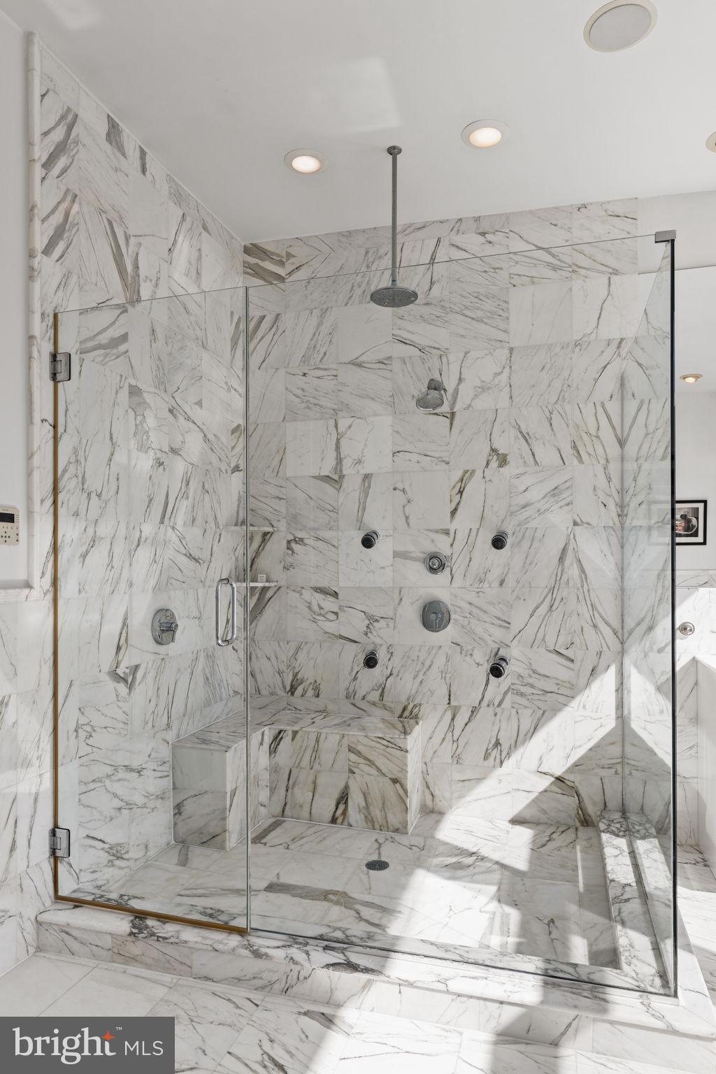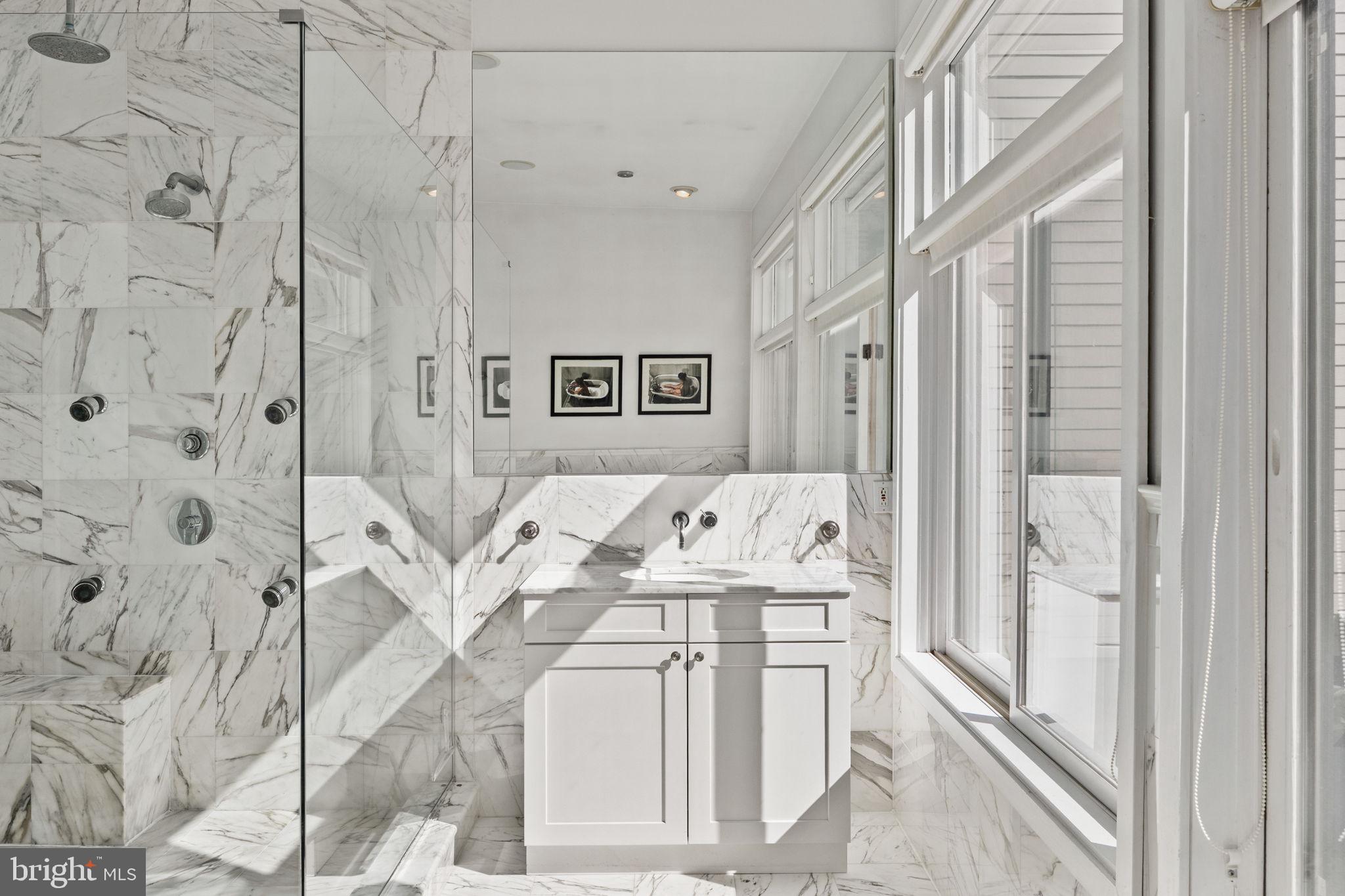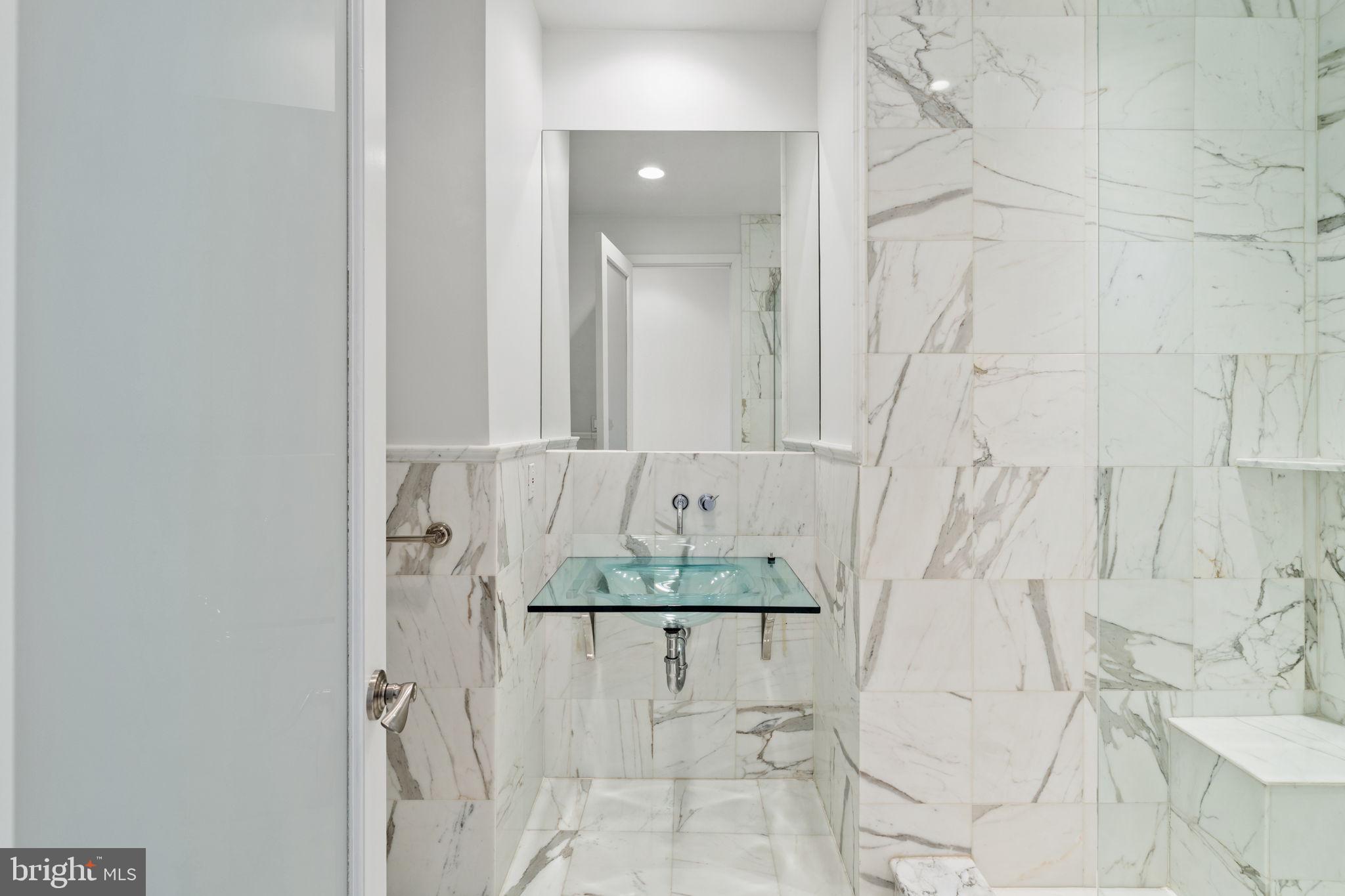 Primary Bedroom Suite constitutes the entire 4th floor. The bed chamber has a floor to ceiling window (which completes the "curtain wall effect from the exterior) with a vivid view of the Christ Church steeple. The hallway leading to the walk in closets, laundry room and full bath with oversized shower, passes along the open central atrium just beneath the large skylight. The natural light in this space is wonderful. The bath chamber also boasts a free standing soaking bathtub and acres of Calacata Borghini Carrara marble tile.