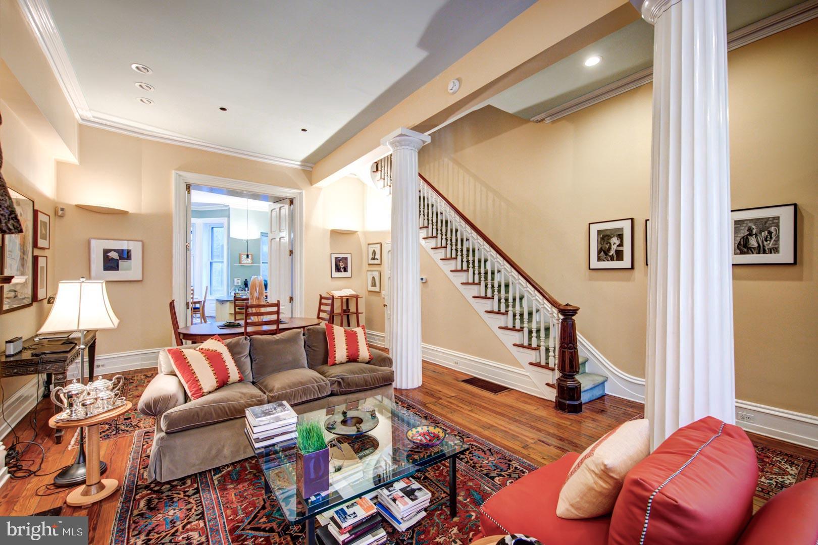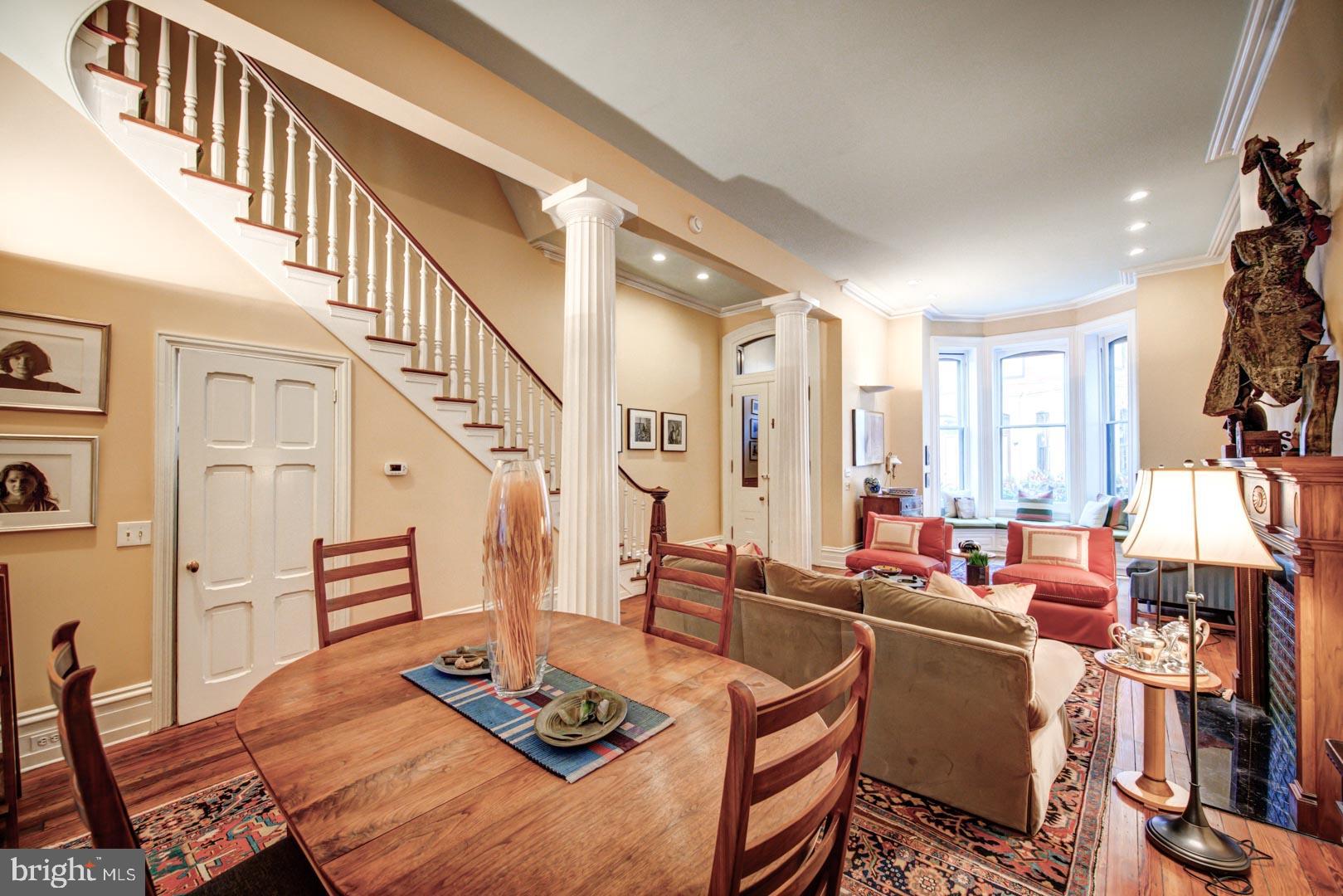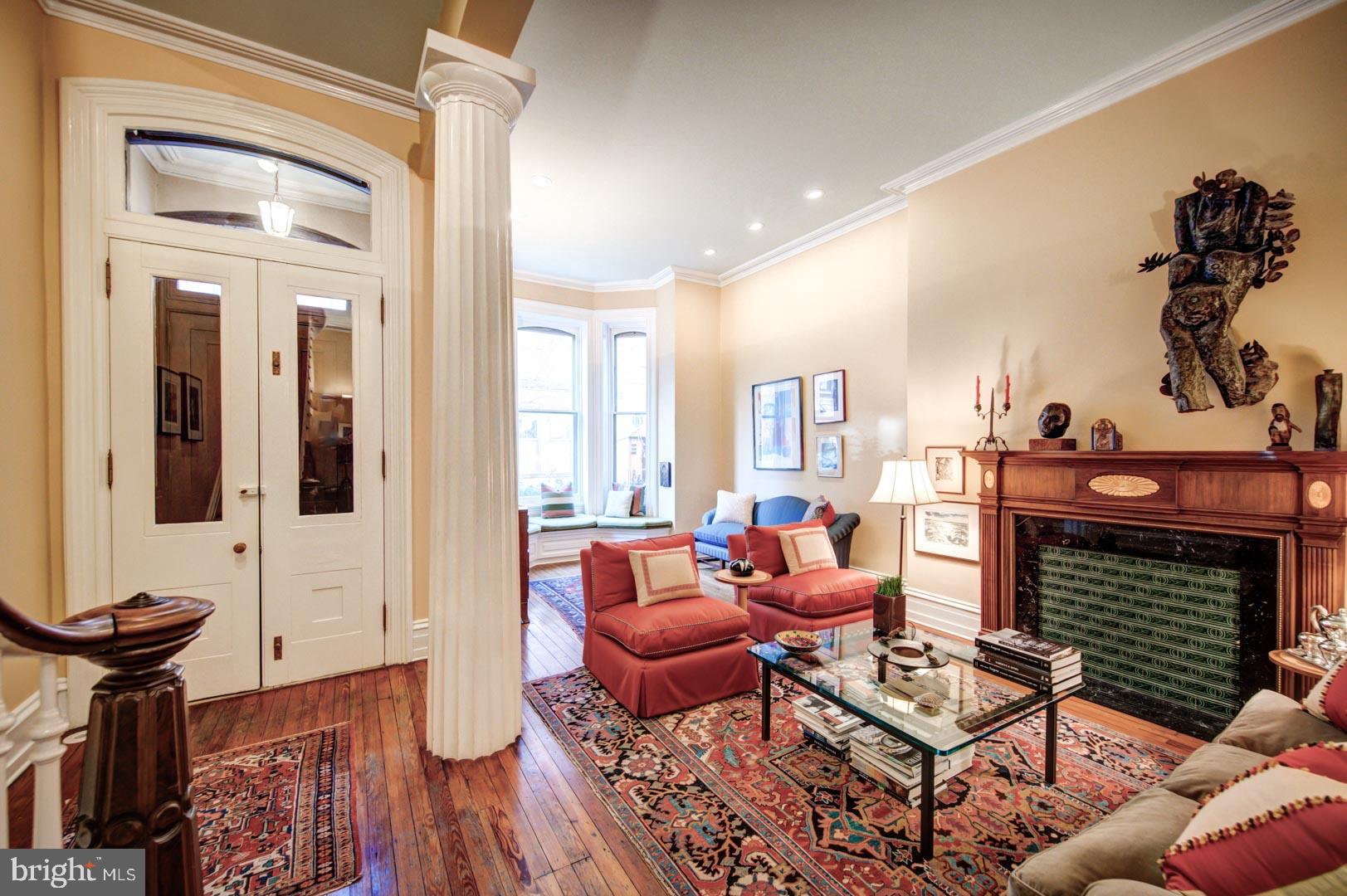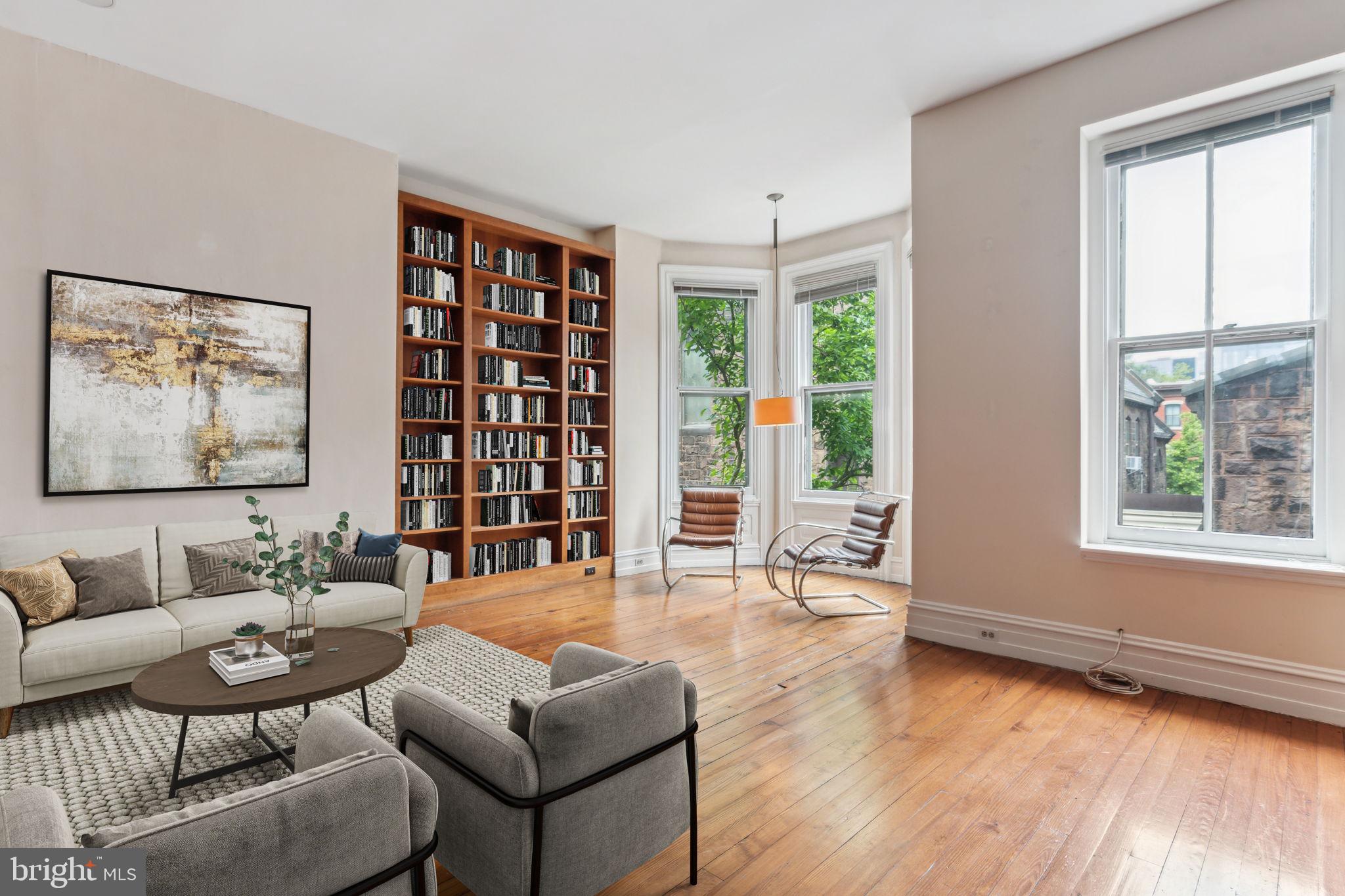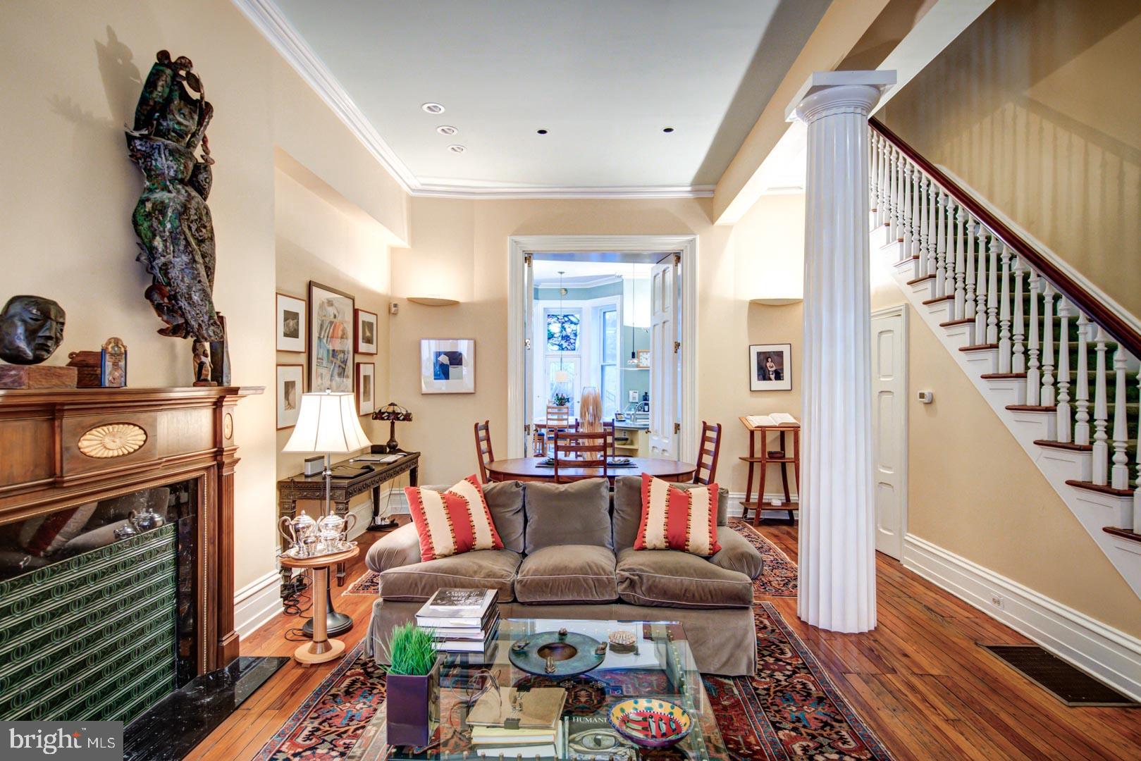 20' wide Quintessential Philadelphia Townhouse on a tree-lined, picturesque block. 5 bedrooms, 4.75 baths on 5 levels. This 1850 home built before domestic electricity is filled with light even on a rainy day. Enter through the vestibule with original tiled floor into a double length living room with soaring 12' ceilings, fluted columns, bay window, wood mantle with green tile insert. Large eat in kitchen with juliet balcony, gas fireplace with distinctive tilework and iron firebox. There is a quarter bath cleverly tucked under the stairs on this level. Upstairs on the second floor is a large library with built-in shelving in the rear and the south facing primary suite in the front of the house. The third floor has two more bedrooms. The rear bedroom has a hall bath and the front bedroom has an en suite bathroom. The fourth floor has two more bedrooms and a jack and jill bath. The english basement is partially finished with a large den and bar, half bath, access to the rear yard and a large storage area in the unfinished section. This home has been very well maintained though some will want to update the kitchen and baths. In addition to all the shopping, theatre and restaurants of Rittenhouse Square the property is 1 block to Fitler Square, 3 blocks to the Schuylkill River Park and Trail. Easy access to 30th Street AMTRAK station, Routes 676, 76 , 95 and the Philadelphia International Airport.