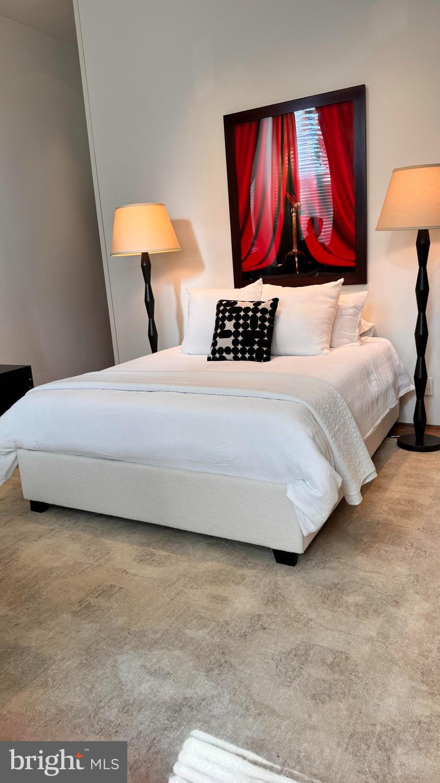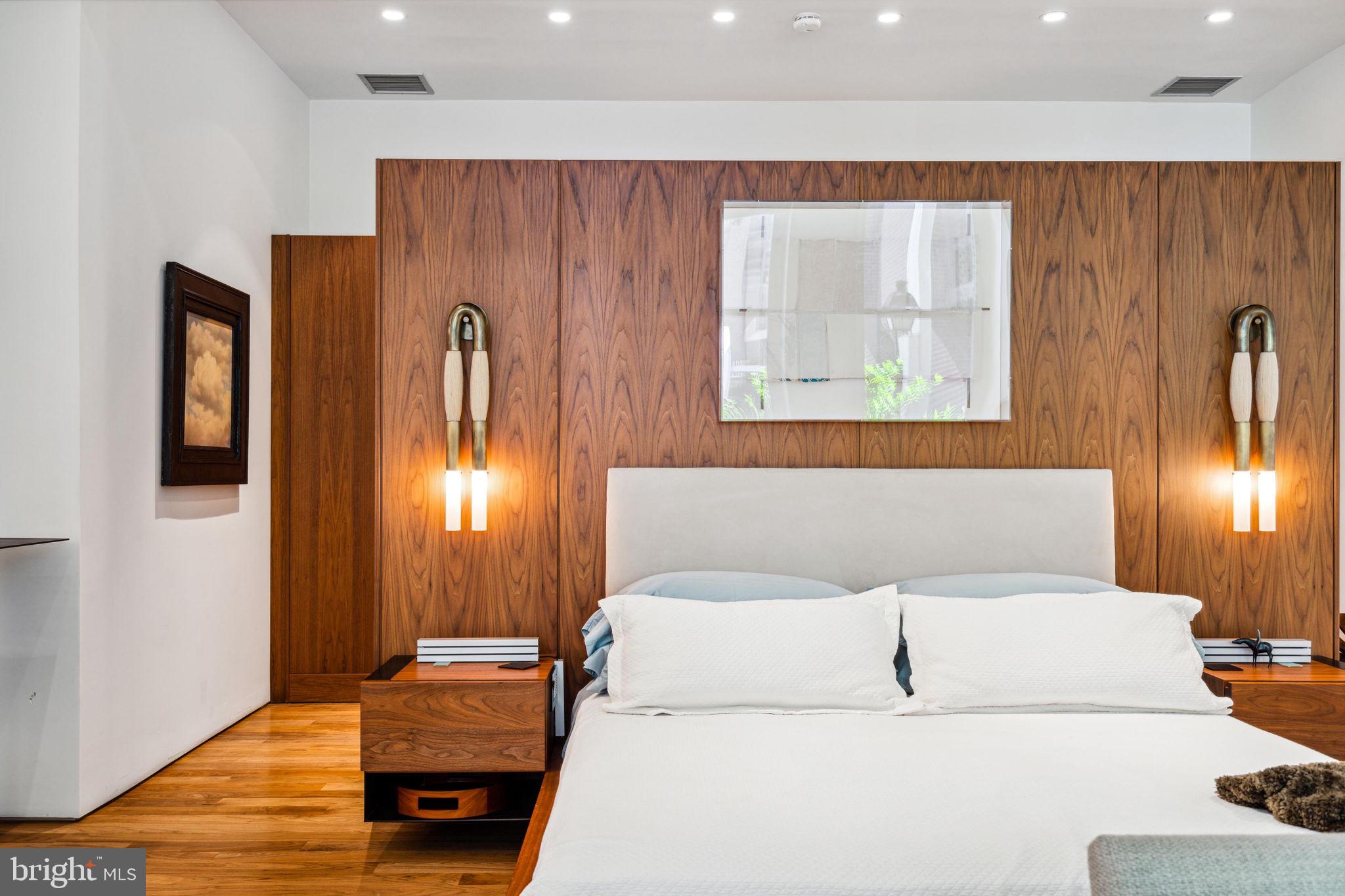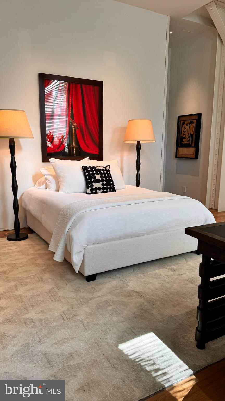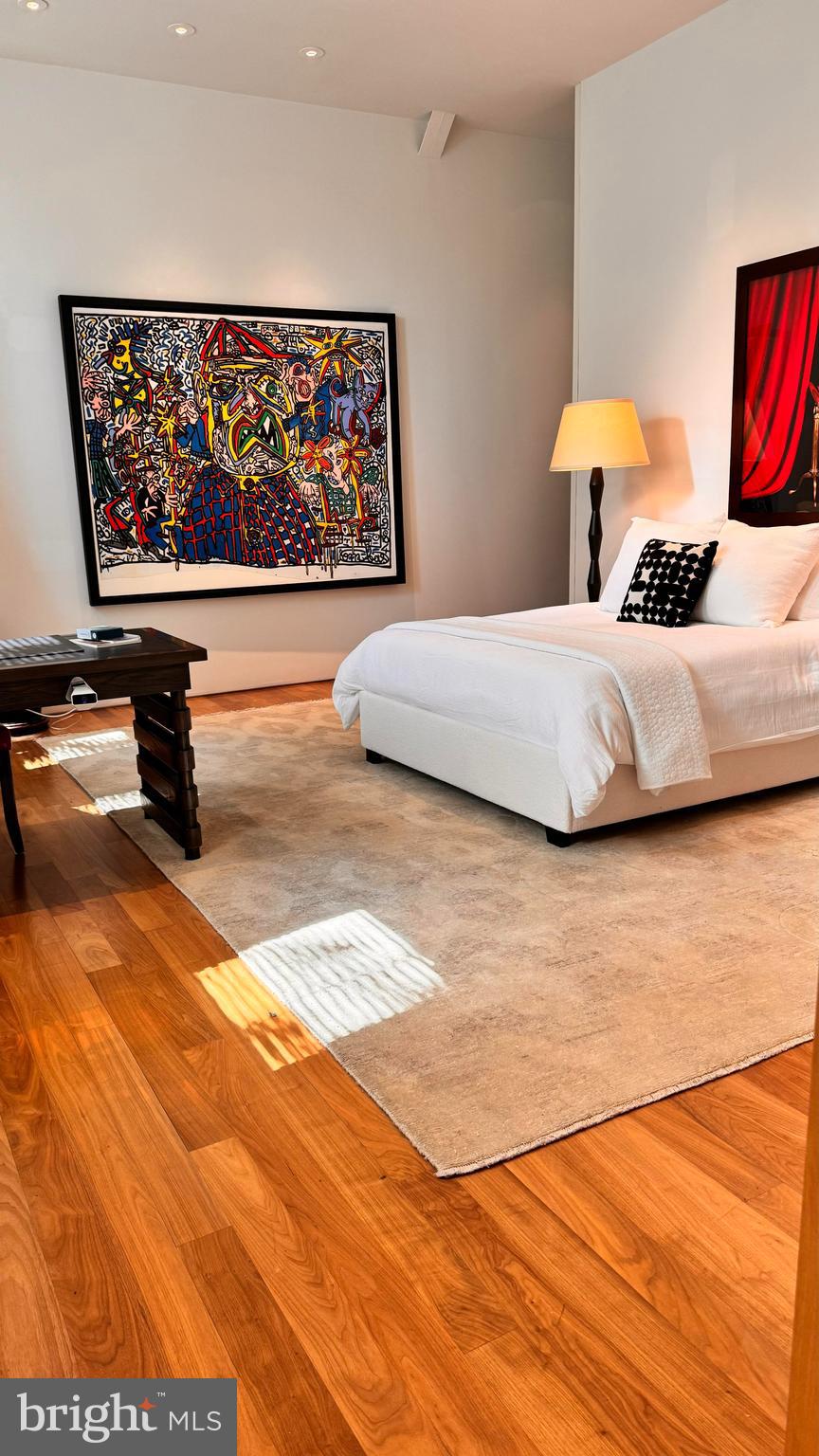 The two generously sized bedrooms feature en suites and customizations. The primary suite includes a custom walnut bed, sitting area, retractable TV, and European bath. The second bedroom, currently a den/bedroom hybrid with built-ins and wet bar, can be used as a guest suite or easily reconfigured into two bedrooms, making this a 3-bed unit.