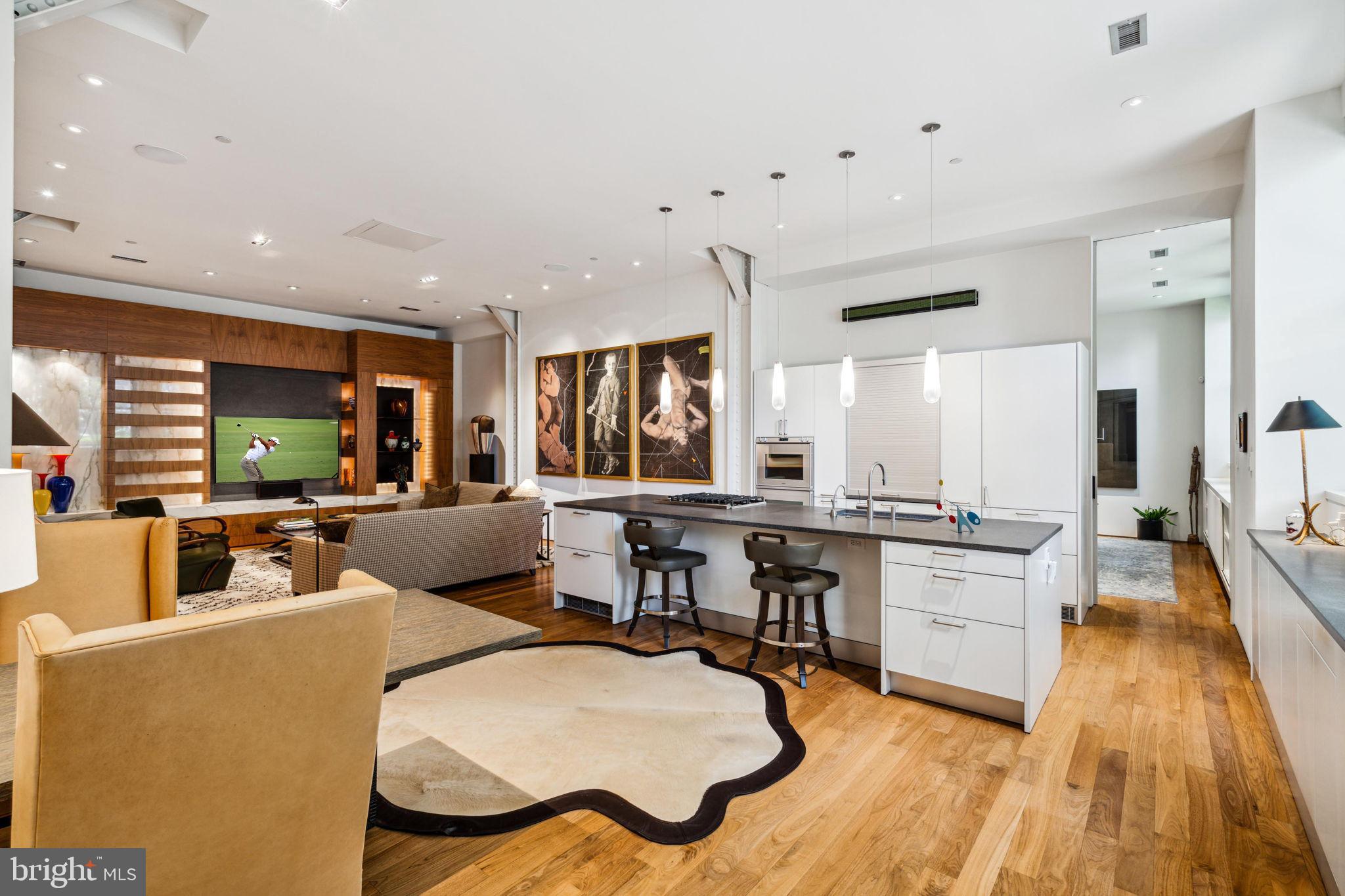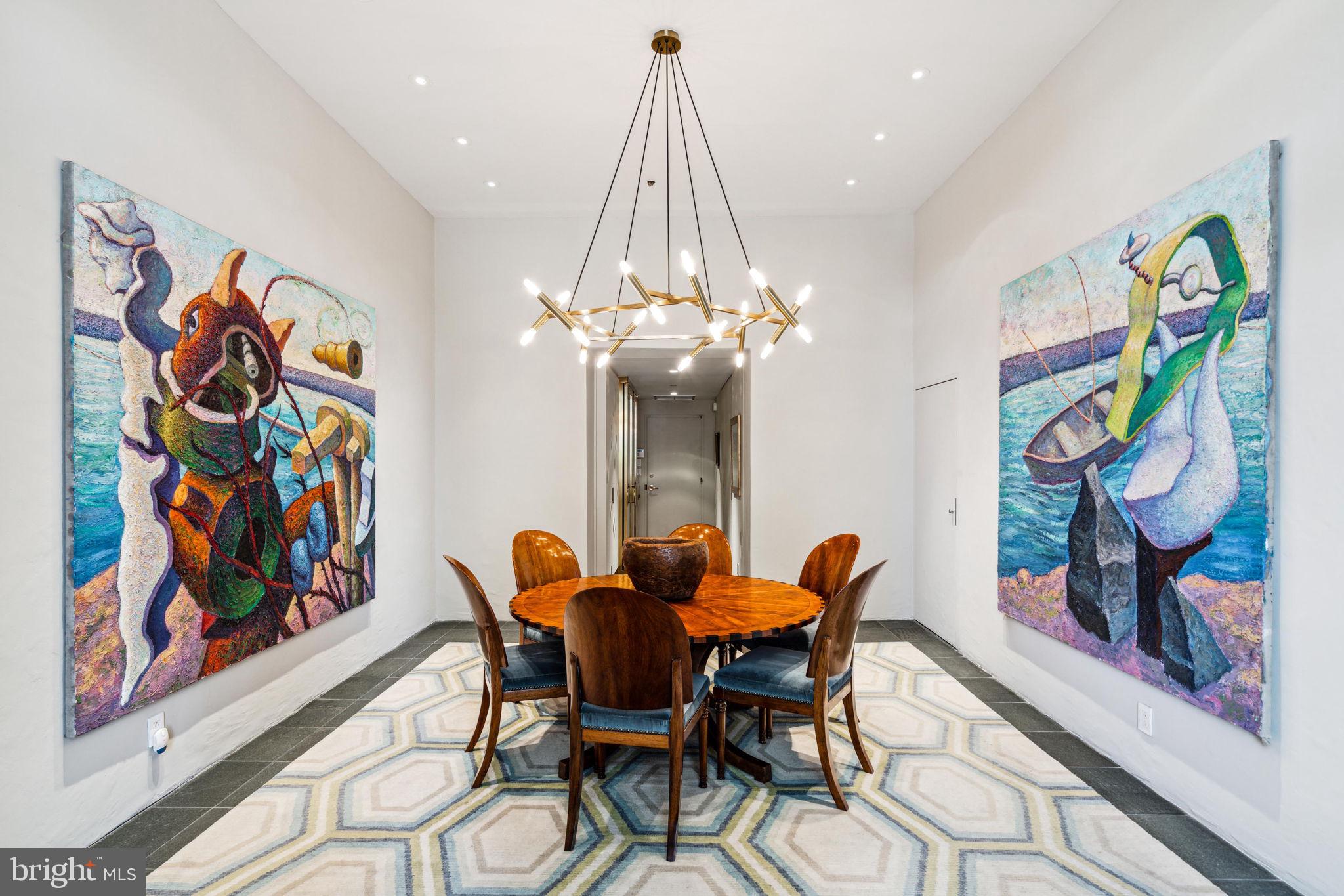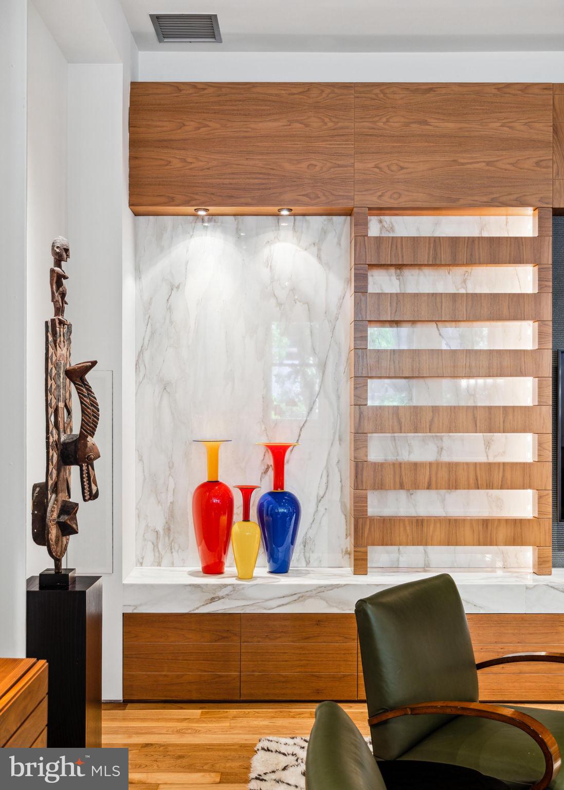 The adjacent great room offers a spacious open floor plan where you can choose to combine kitchen, dining, and living all-in-one for entertaining, or create more of a focus in its utility. Featuring calcutta gold marble, a walnut bookcase/entertainment wall, a chef's kitchen with Gaggenau and Miele appliances, basalt counters, double dishwashers center island, and a conveniently located half-bath, this space combined with the great room gives you more than enough square footage to configure the primary living space for your lifestyle needs.