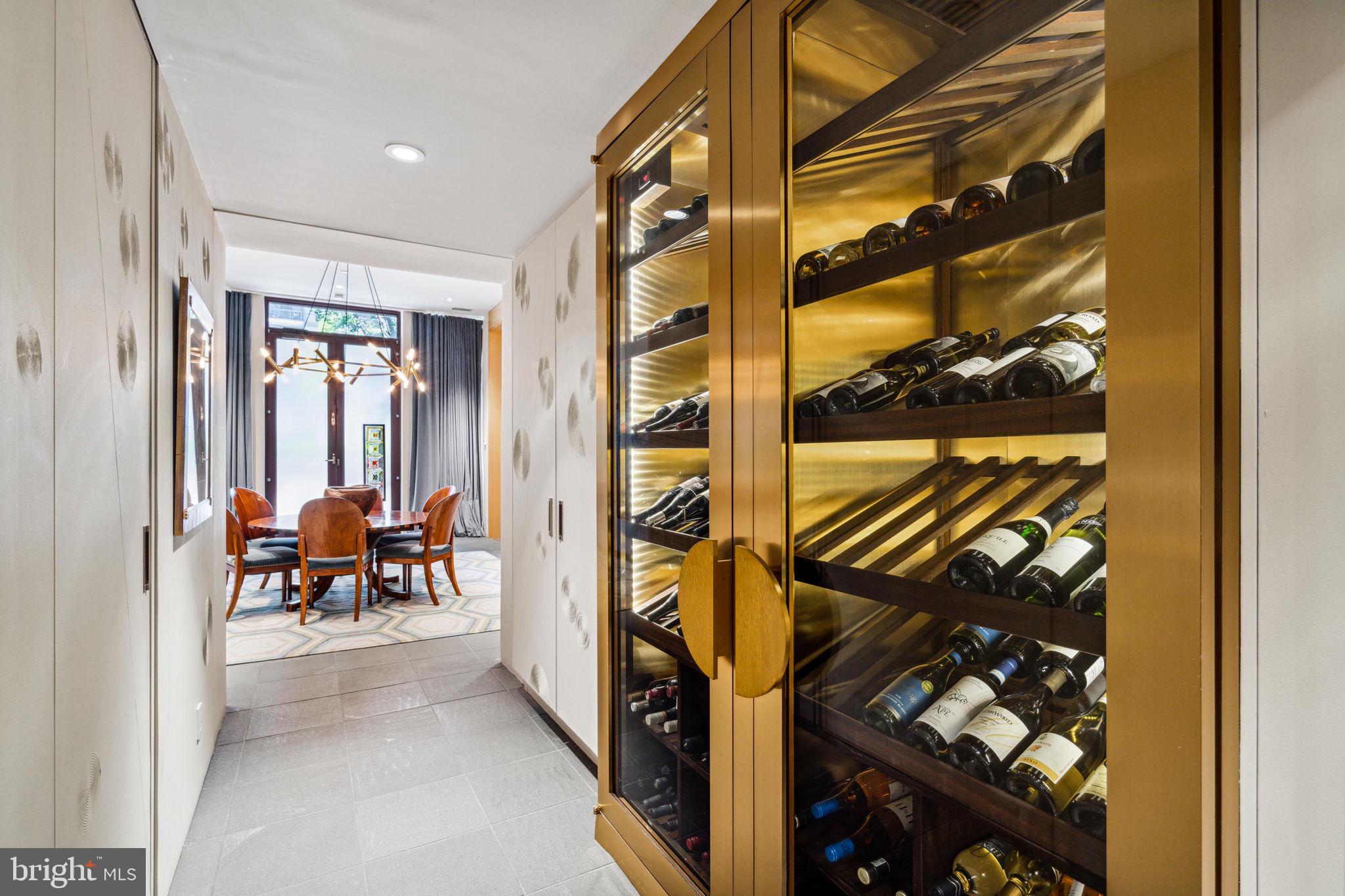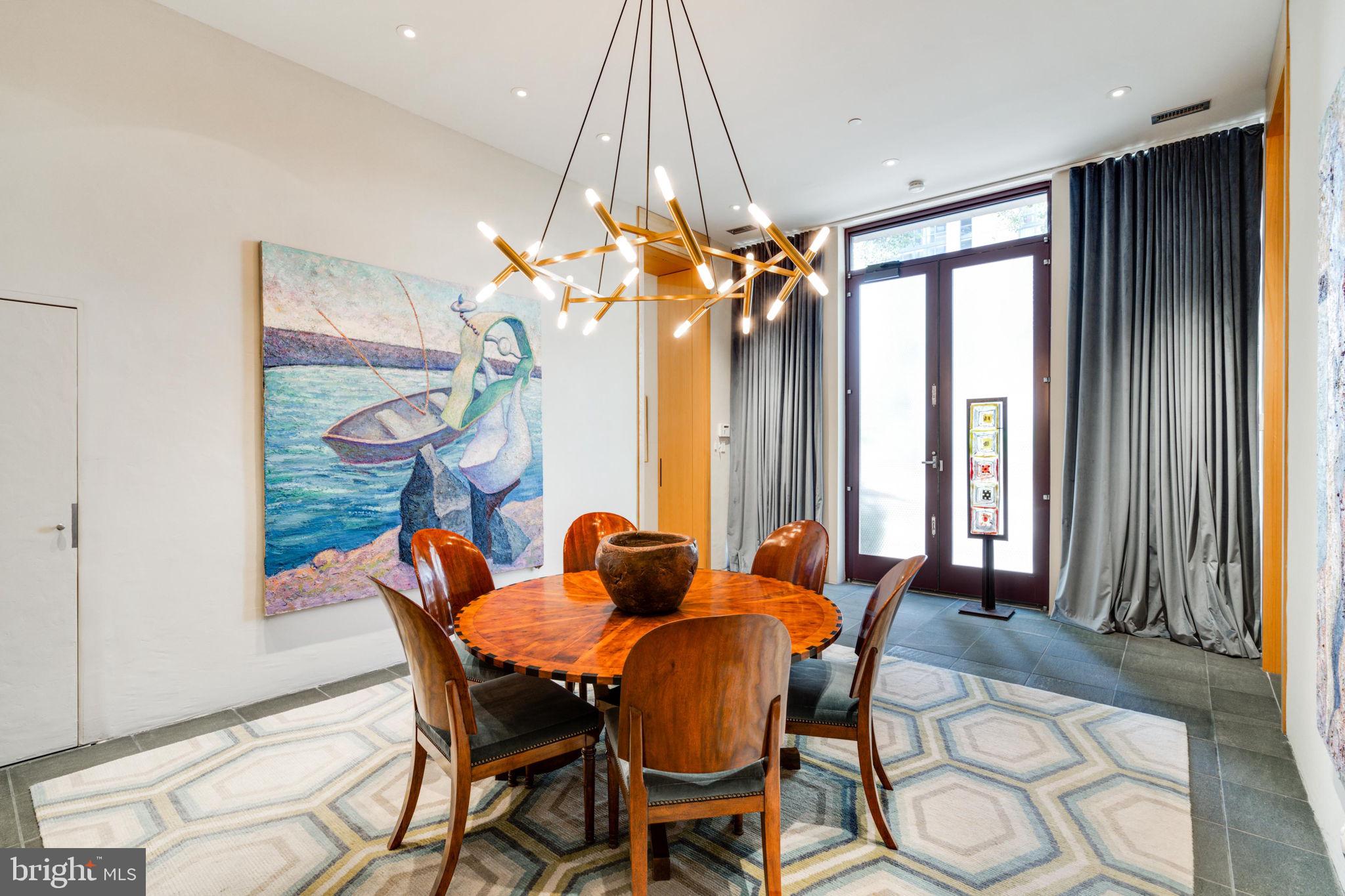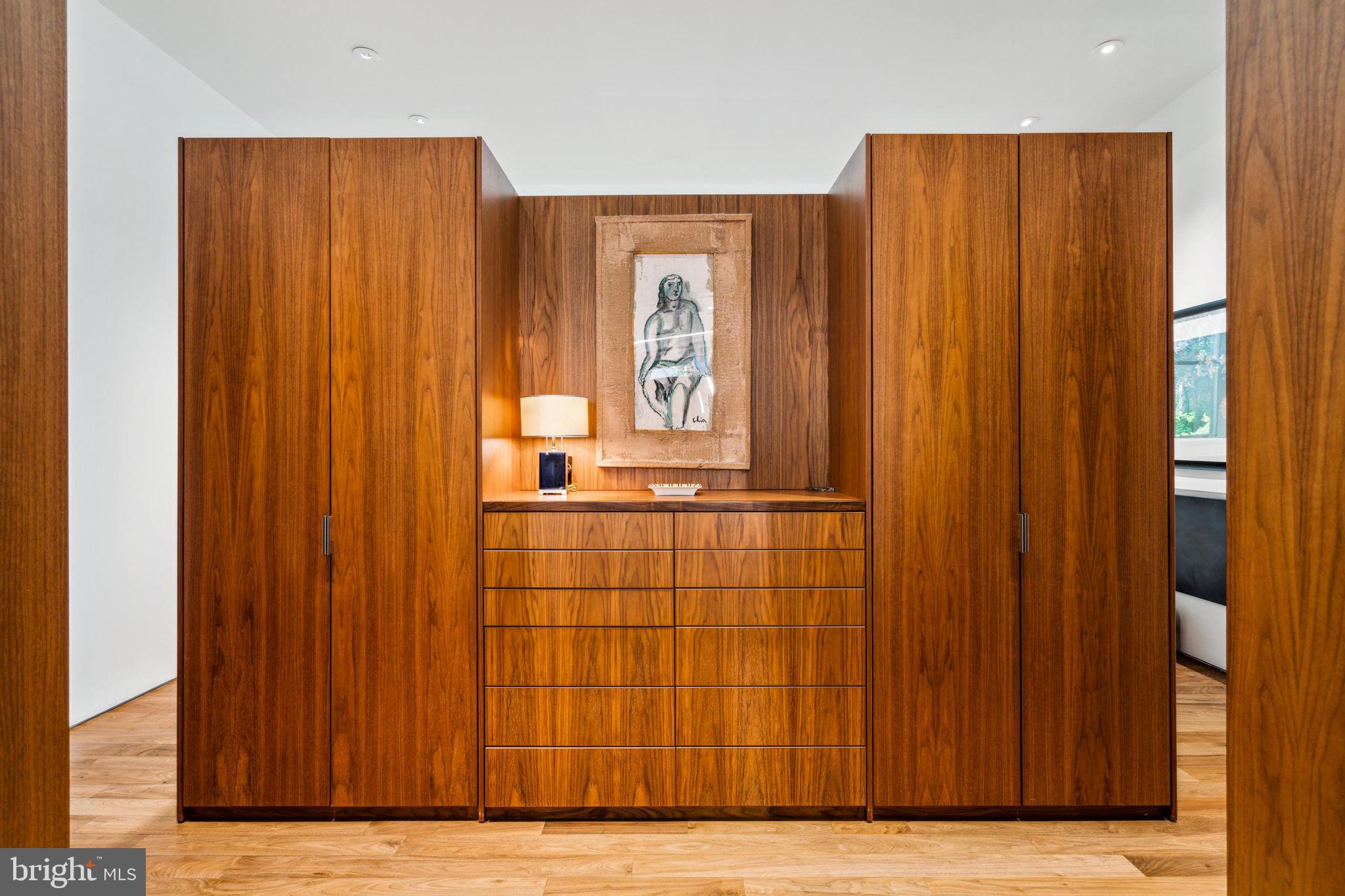 The adjacent great room offers a spacious open floor plan where you can choose to combine kitchen, dining, and living all-in-one for entertaining, or create more of a focus in its utility. Featuring calcutta gold marble, a walnut bookcase/entertainment wall, a chef's kitchen with Gaggenau and Miele appliances, basalt counters, double dishwashers center island, and a conveniently located half-bath, this space combined with the great room gives you more than enough square footage to configure the primary living space for your lifestyle needs.