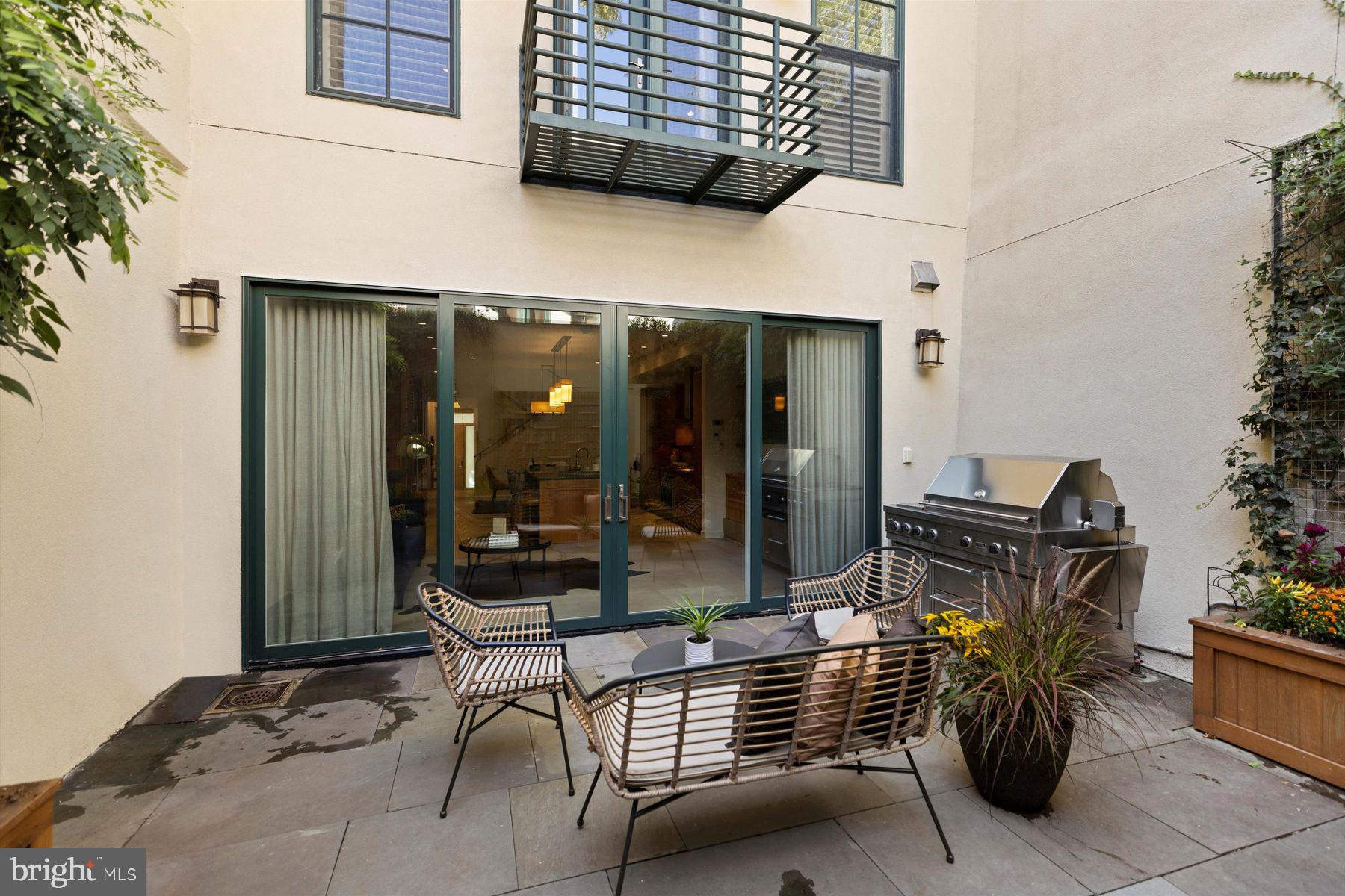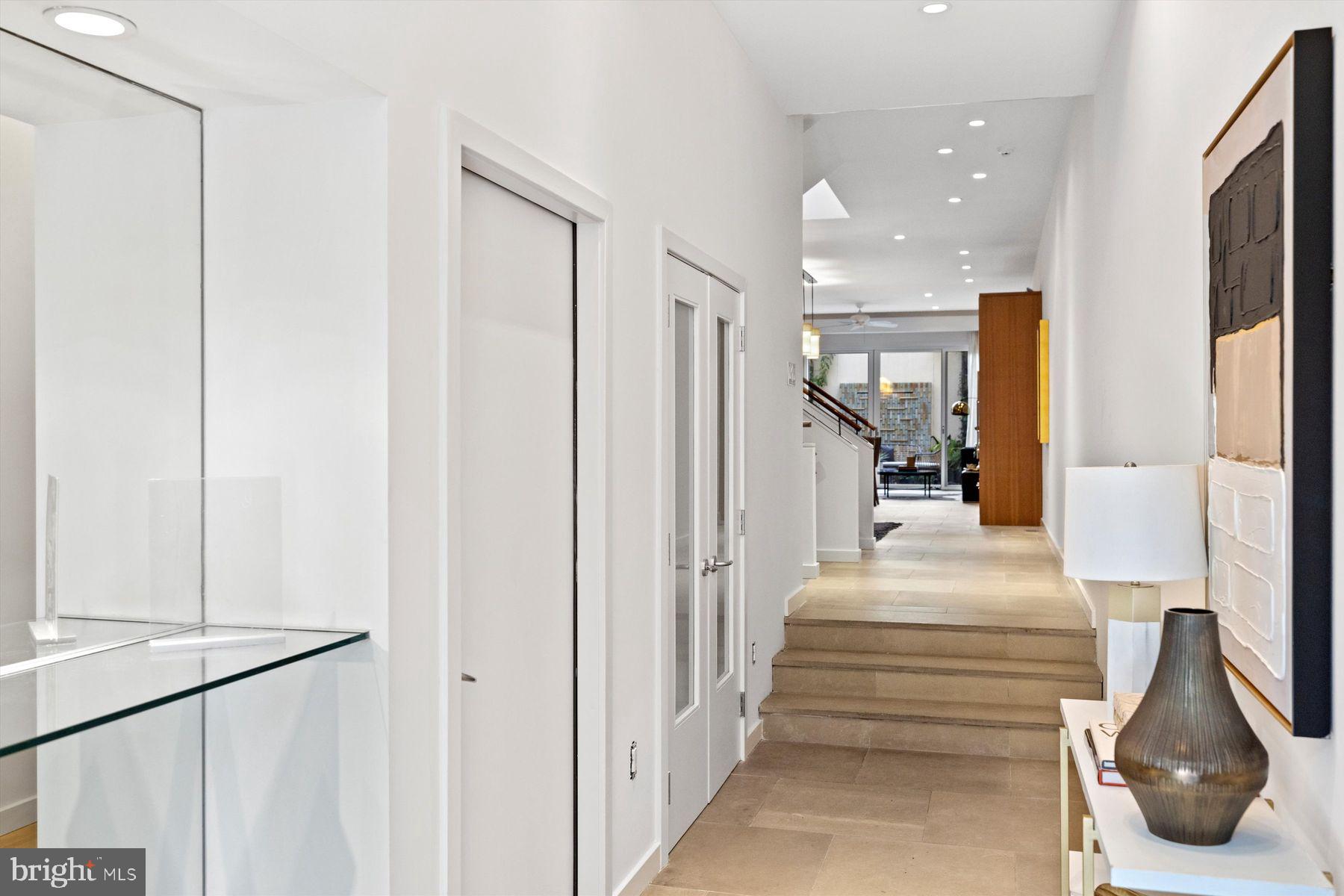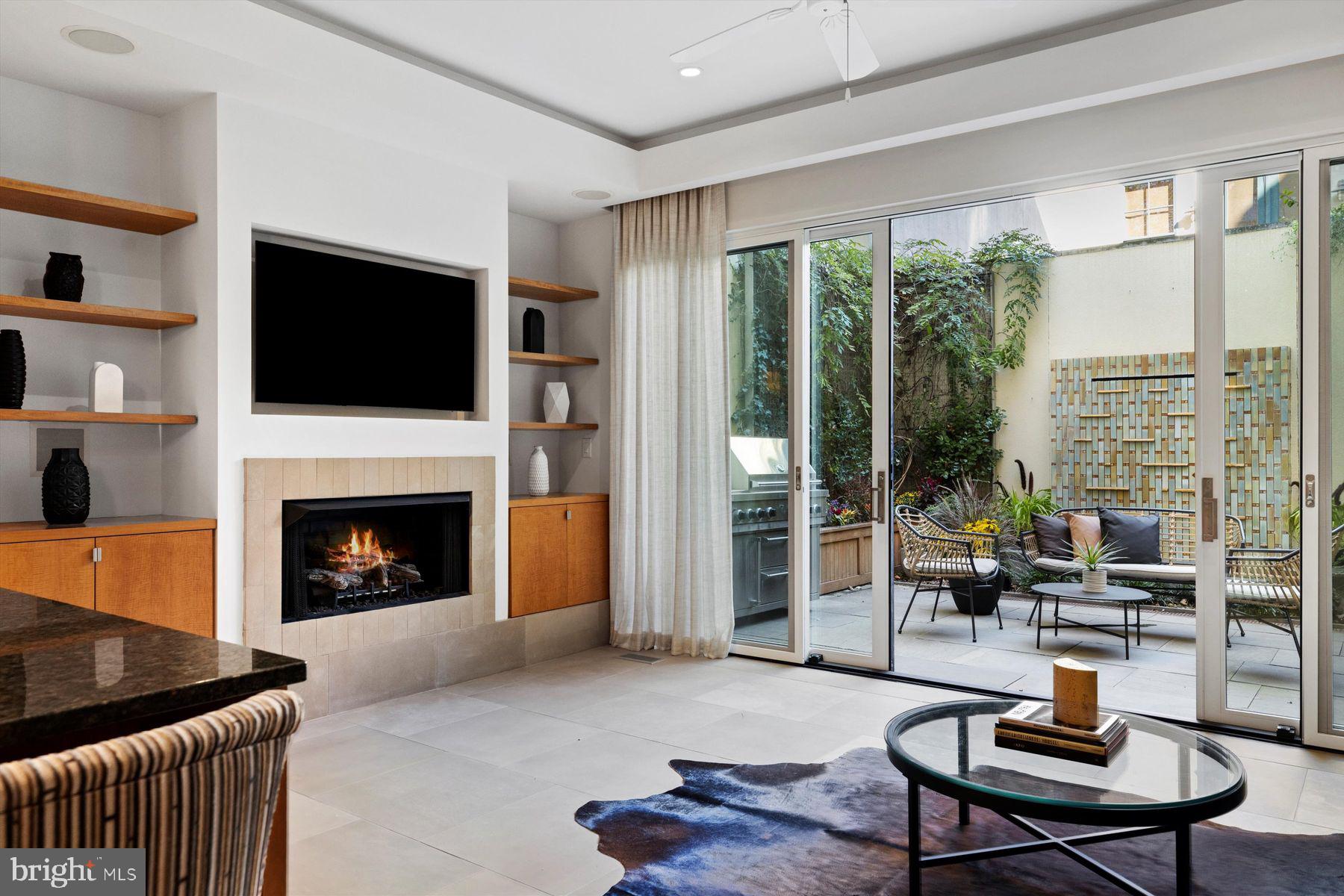 A perfect fit with the streetscapes of Rittenhouse Square, this brick townhouse rises three stories and offers a floor plan and contemporary finishes well suited to how many of us live today -- enjoy a main level with great flow to a private patio garden and note multiple offices for those who work from home. Enjoy the luxury of an attached one-car garage with interior access to a light-filled, expansive floor plan with elevator serving all levels. The grand-scale entry level offers a cook's kitchen with a wealth of storage, big island and five-burner gas cooktop. The kitchen opens to the dining area as well as a casual seating area with fireplace and built-ins. Step outside to a private garden oasis with an exquisite waterfall. A formal living room on the second level is yet another beautifully designed, airy space with treetop views, built-ins and a second fireplace. On this level and separated by a landing with excellent storage is the primary bedroom suite. Overlooking the garden, this is a very restful, light-infused room with a wall of built-ins, multiple closets with organizers, French doors opening to a Juliette balcony and a deluxe bathroom. The bathroom is designed for two - two toilet rooms, two sinks, an oversized seamless glass shower and a Maax soaking tub finish this marble retreat. The third floor, with a landing topped with three skylights, presents two en suite bedrooms, an office and additional storage. As a bonus, the lower level is finished to include a home office lined in library shelving complete with rolling ladder. A wet bar with wine cooler and undercounter refrigerator completes this space. An adjacent full bath suggests this could also be an au pair suite/4th bedroom. In the Greenfield School catchment with access to both Rittenhouse and Fitler Squares, this townhouse is an outstanding choice for the buyer seeking a residence that balances design and quality throughout its 6,400 square feet of living space.