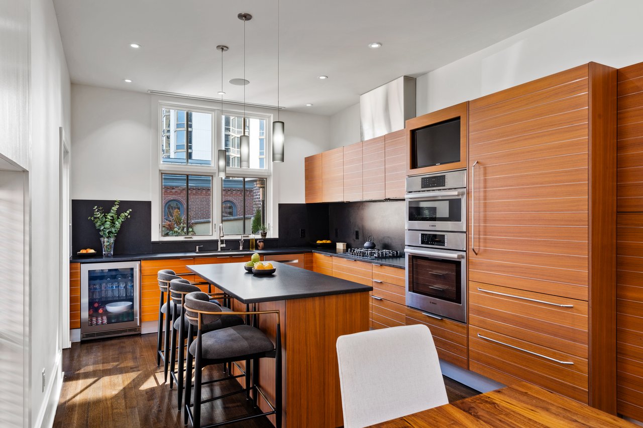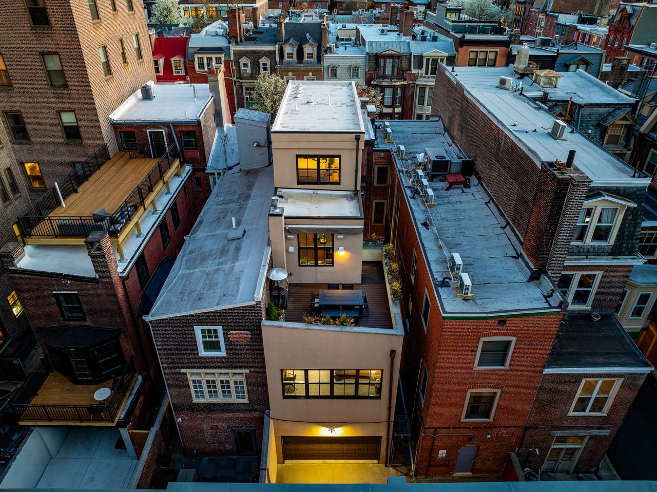 A 4 bed + gym, 5.5 bath contemporary townhouse only 1.5 blocks from Rittenhouse Square and with 2 car garage parking! Be prepared for a “WOW” behind the historic (Circa 1800) facade. Open into the bluestone foyer and entry hall that dazzles with over 14 foot ceilings and an amazing, one-of-a-kind handcrafted centerpiece sculptural staircase that is both an architectural design element and a vehicle for spreading light throughout the home via 4 tubular skylights. Perhaps the most impressive and unique space in this home is the entertaining hub. On the 3rd floor, which offers seamless indoor & outdoor living you'll enjoy a private deck oasis wrapped with planters (irrigated), a clear exposure of the skyline, BBQ with built-in gas line and a retractable awning (perfect for al fresco dining) If you enjoy entertaining or cooking you’ll love the modern kitchen with updated appliances, Snaidero Italian cabinetry, granite black leathered countertops and backsplashes, massive windows (2 sides), vaulted ceilings, terrific prep space, double ovens, counter seating, and open flow to the dining, powder-room and grand living room. The living room runs the full width of the home (18 ft) and overlooks Locust St to the south. Amazing sun! Amazing light! The impressive and luxurious primary suite located on the 2nd floor offers dual bathrooms (his & hers), a walk-through rainfall shower, a walk-in closet, an additional 19.5 linear feet of built-in closets and a large bed area with room for seating. Not many homes have a primary suite like this! 3 additional bedrooms; one on the 1st floor (now used as an office) with a full shared hall bathroom, an en-suite on the 2nd across from the primary suite and a super private en-suite on the 4th. Thoughtfully designed by owner-occupants for a multitude of lifestyles – this re-imagined townhouse offers elegant & gracious spaces, ultimate privacy for you and your guests and beautiful quality finishes throughout. Bonus features: A 4 stop elevator (basement to 3rd floor) for supreme convenience, An additional room on the 1st floor currently used as a yoga room, a lot measuring 90 feet deep going street to street (Locust to Saint James), room for guest parking (3rd car) behind the garage, fully wired for sound/internet, intercom camera system (front door entry), water & air filtration and water softening systems and extensive storage. The perfect size…. a manageable townhouse experience you’ve always wanted that is move-in-ready! A location rivaled by few – steps from the Square, Philadelphia’s best dining establishments, Central Business District and a quick walk to our renowned green spaces along the River.